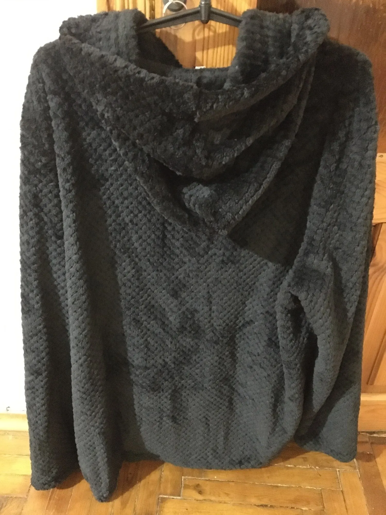 Это, конечно, никакое не пальто, а лёгкая кофта-толстовка, но, к счастью, размер подошёл и сшита хорошо, без изъянов. На тёплую весну или осень вполне пригодится. Сзади длиннее, рукава длинные и свободные, пришитый капюшон.