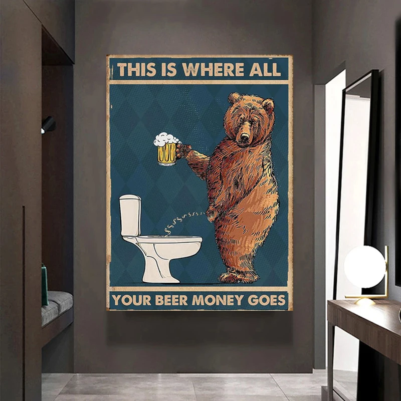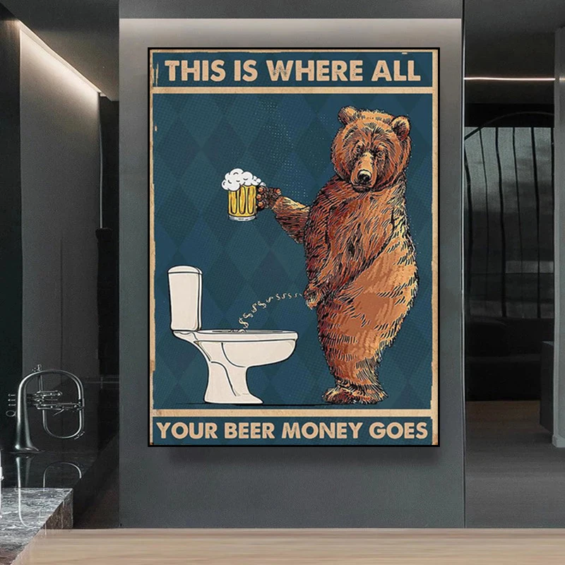 Постер на холсте в туалете, медведь журкий, питьевое пиво в ванную ...