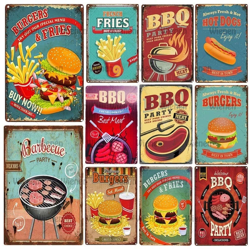 Гамбургеры, картофель фри, хот-дог, винтажный декор, табличка, барбекю, зона, металлические жестяные знаки, лозунг для барбекю, правила, кухонные настенные плакаты, Декор