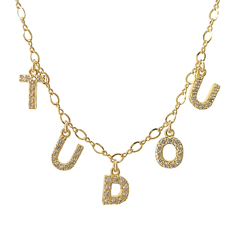 Ожерелье с именем инициалом, ожерелье с инкрустацией фианитами и буквами, ожерелье с именем на заказ, ожерелье с золотистыми искусственными камнями, ювелирные изделия