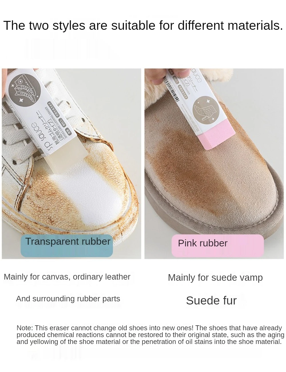 Примечание: Этот ластик не может превратить старую обувь в новую обувь! Также невозможно восстановить обувь, которая уже произвела химические реакции, такие как пожелтение обуви или проникновение масла в материал обуви.