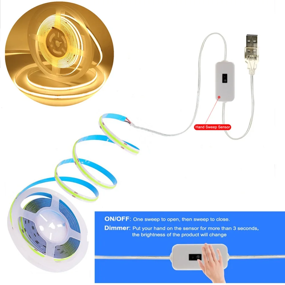 RA90 высокая яркость гибкий COB светодиодный ленточный светильник 5 в 320 светодиодов/м USB Ручной развертки сенсор лента переключения веревка лента кухонный шкаф подсветка светильник лампа
