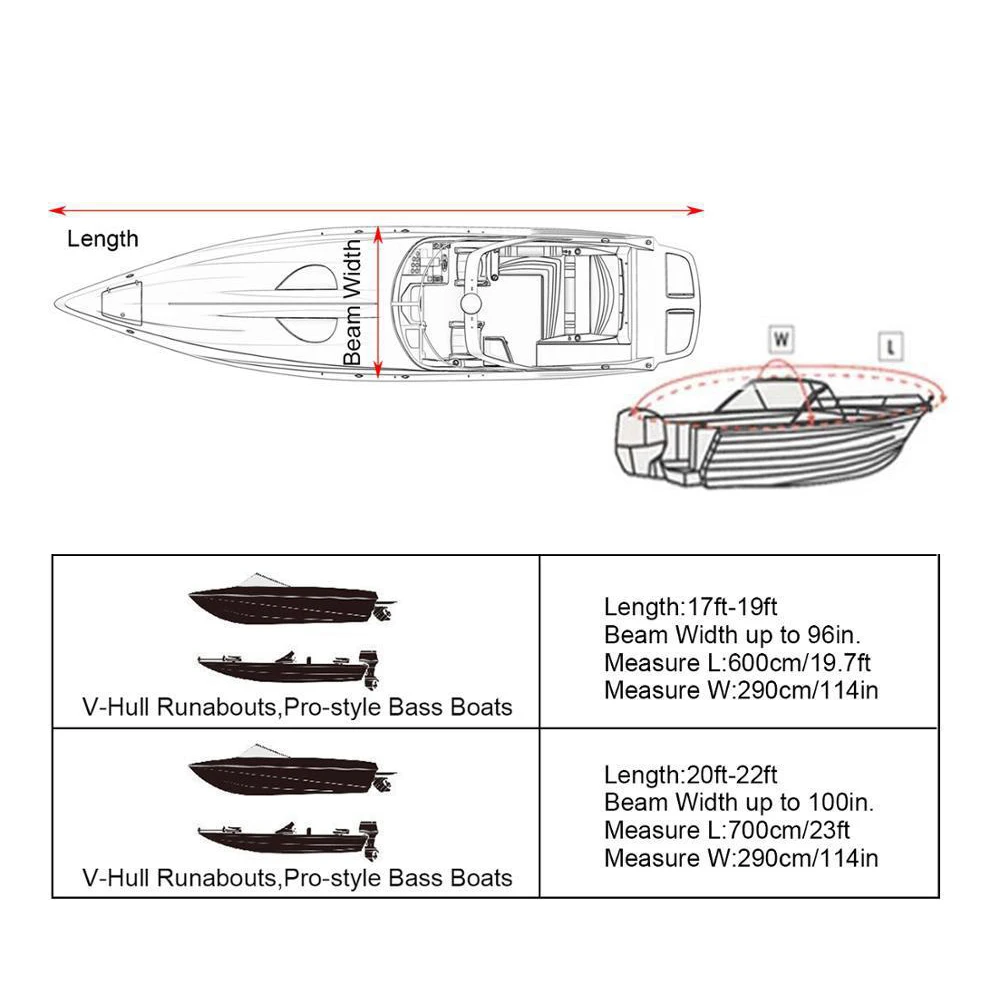 [Сверхмощный чехол для лодки]: Изготовлен из прочного морского полиэфирного холста с водонепроницаемым покрытием 600D из ПВХ☔, Устойчив к ультрафиолетовому излучению☀И дизайн вентиляционного отверстия. Подходит для лодок длиной до 17ft-19ft или 20-22ft и шириной луча до 96in, пожалуйста, обратитесь к таблице размеров крышки лодки, чтобы найти правильный размер, чтобы соответствовать вашей лодке.