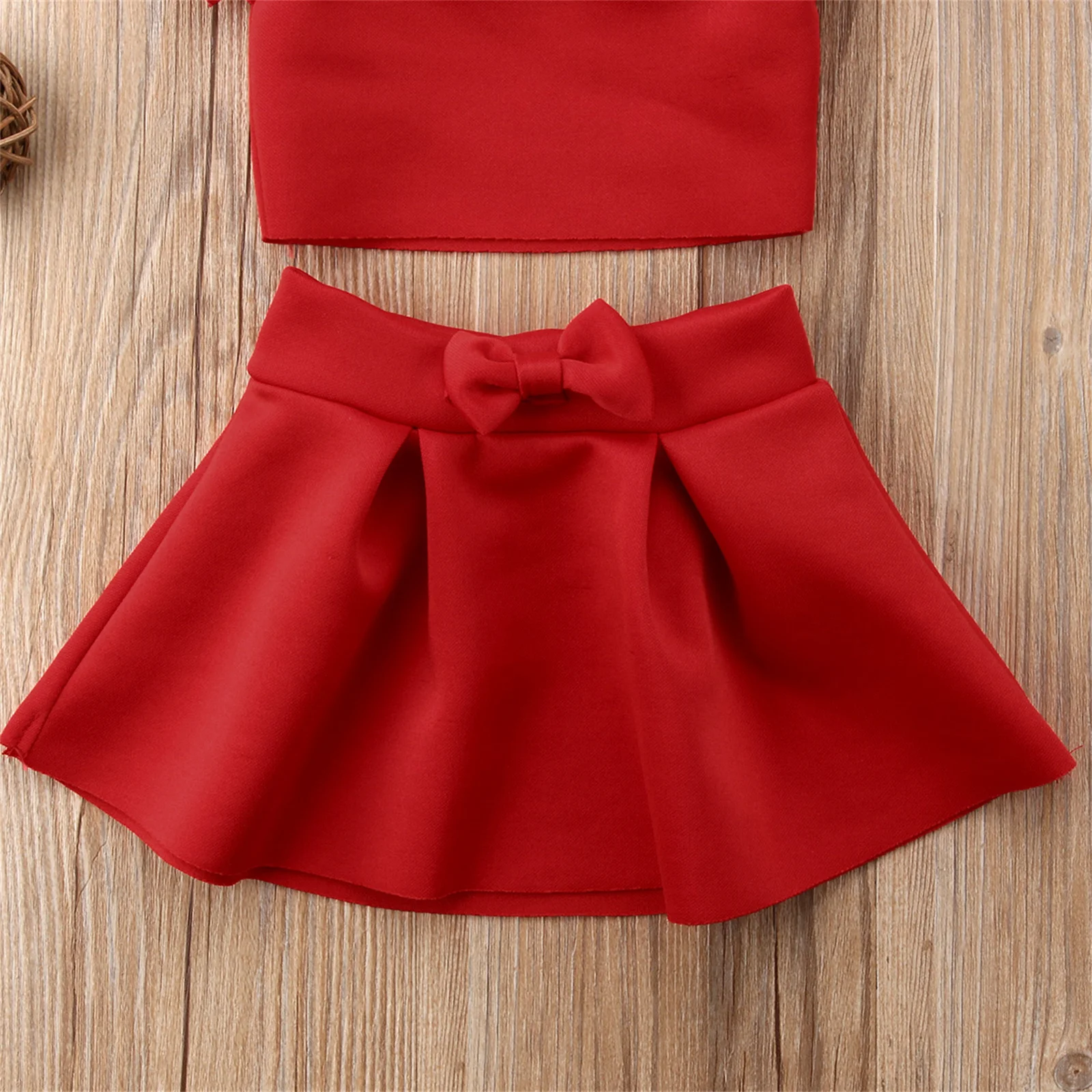 Новинка 2021, летние детские комплекты, наряды из 2 предметов для маленьких девочек, укороченный топ с открытыми плечами + юбка с мини-бантом, однотонные праздвечерние чные костюмы