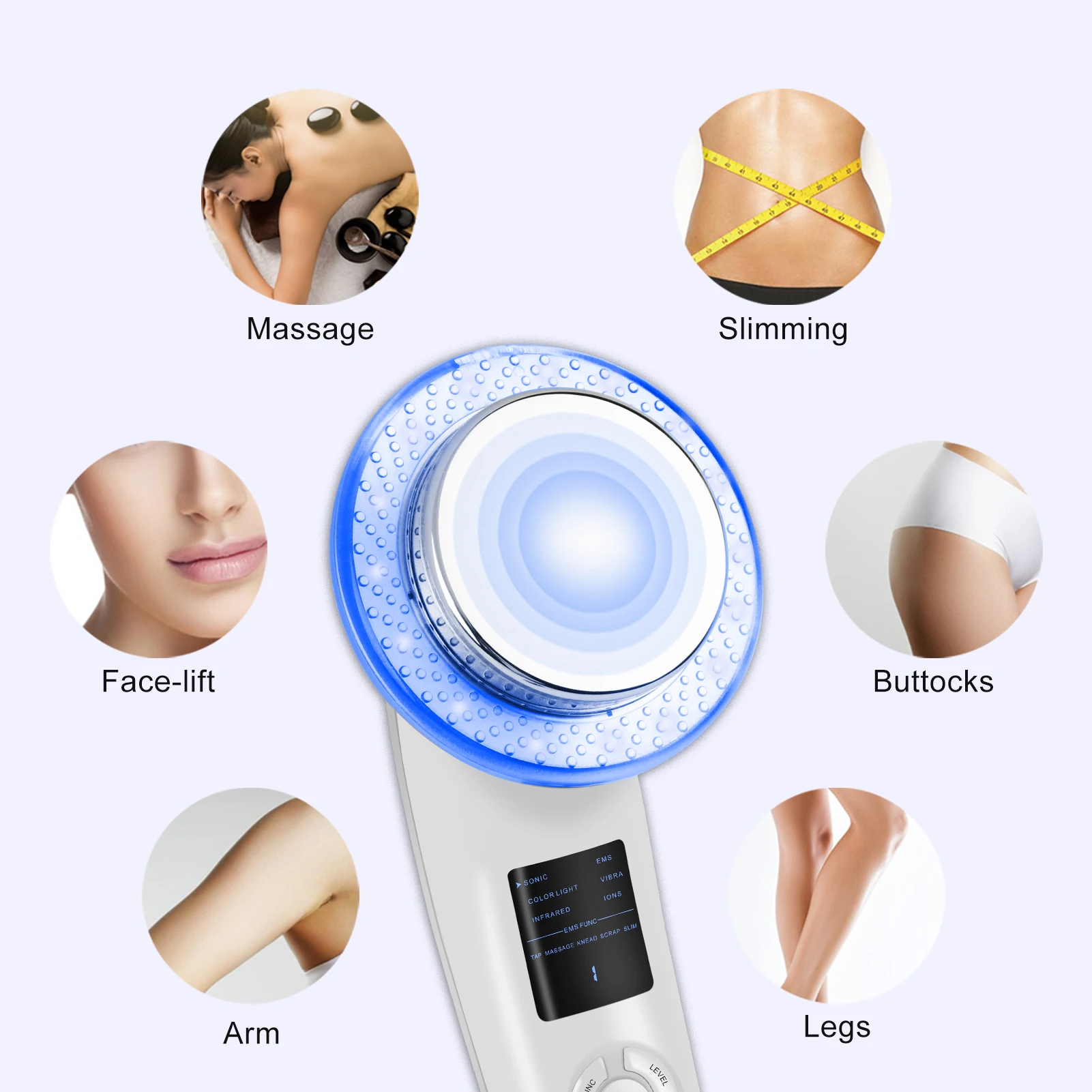 5. Это устройство принимает ультразвук 1 МГц и инфракрасную энергию для массажа и эффективного лечения кожи, а также для выполнения ультразвукового массажа для похудения, чтобы лепить контур тела, устранять лишний жир, тонизировать мышцы, стимулирует здоровую функцию тела через омоложение клеток и восстановление метаболизма тела.