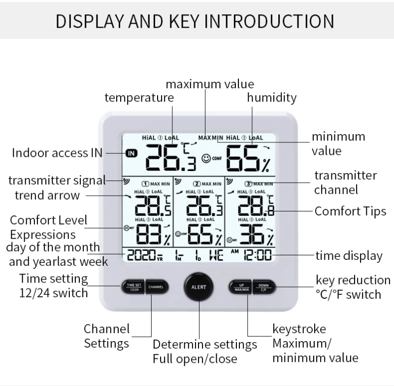 1. Может отображать три канала и температуру в помещении и влажность в то же время, трехуровневый дисплей для комфортного использования в помещении