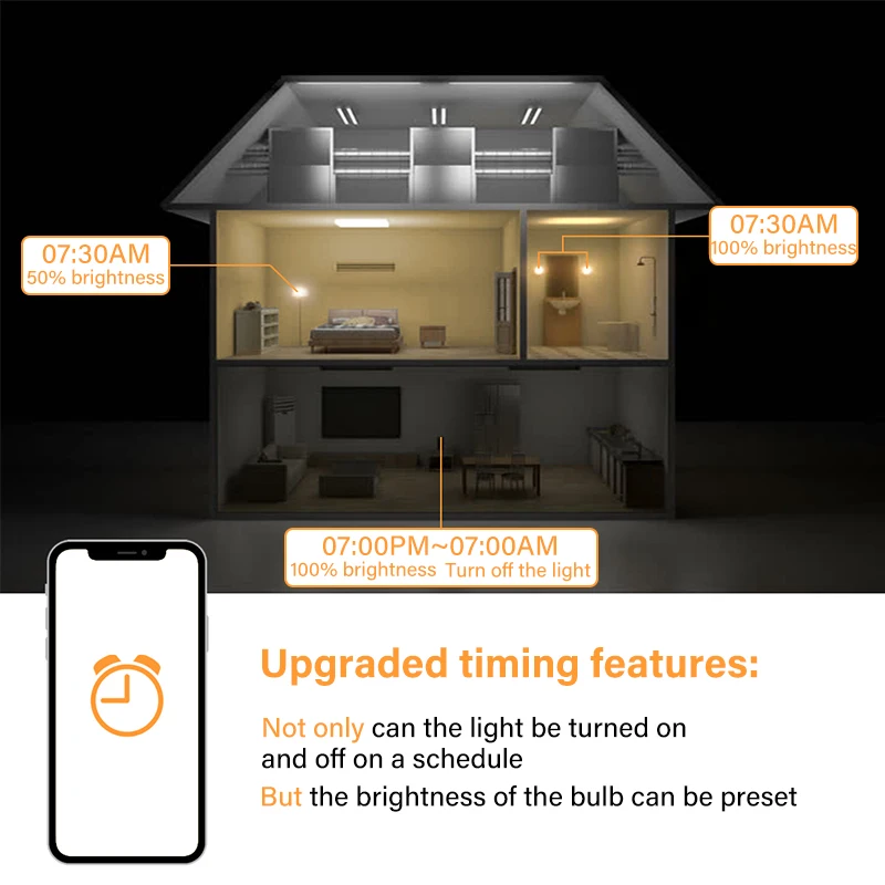 Никогда не Возвращайтесь домой в темный дом-используя светильник в приложении и получайте теплый светильник. Функция таймера позволяет автоматически включать и выключать умный светодиодный светильник.