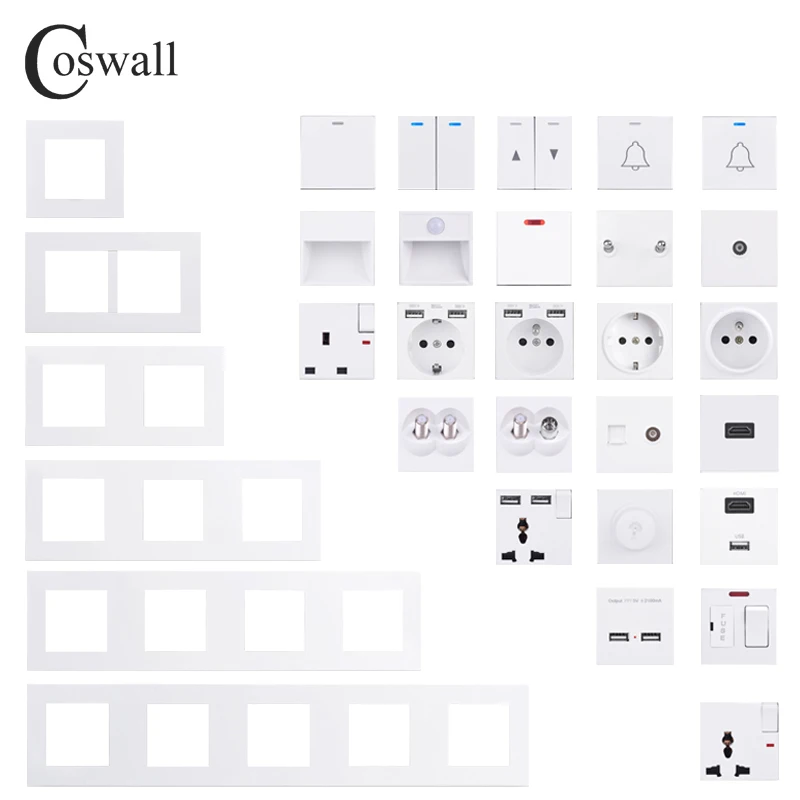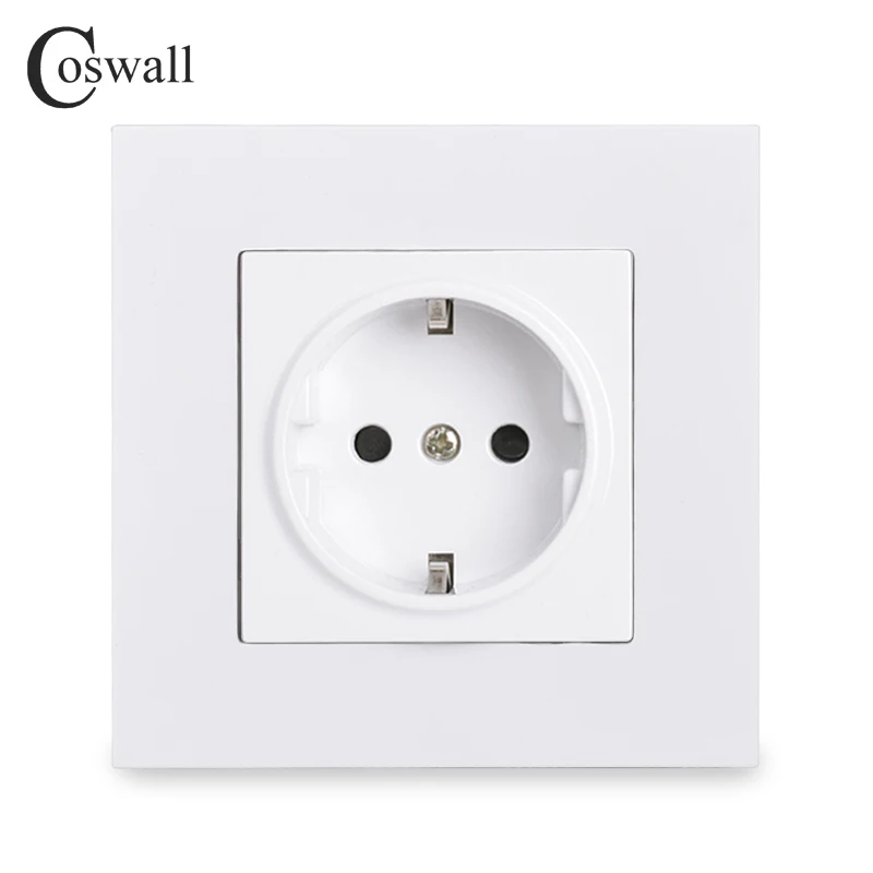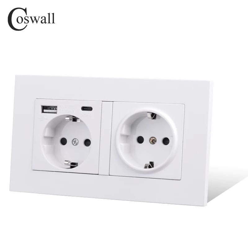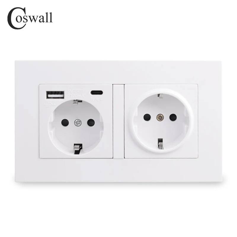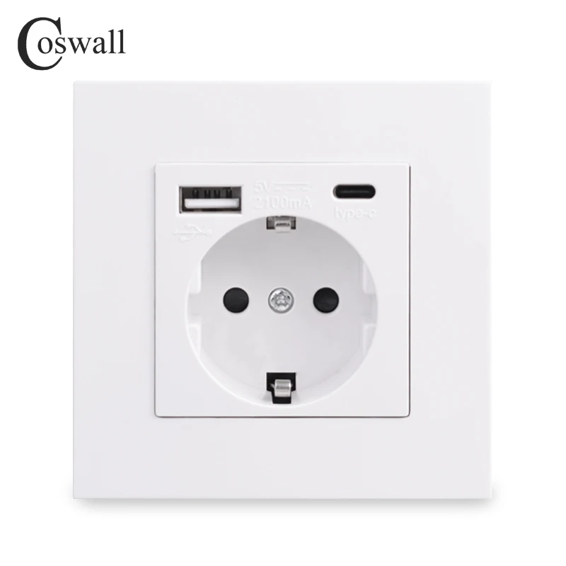 Настенная розетка COSWALL Европейского, испанского, русского стандарта, с заземлением, USB тип A и Тип C, макси-порт зарядки 2 А. PC Panel White E20 Series