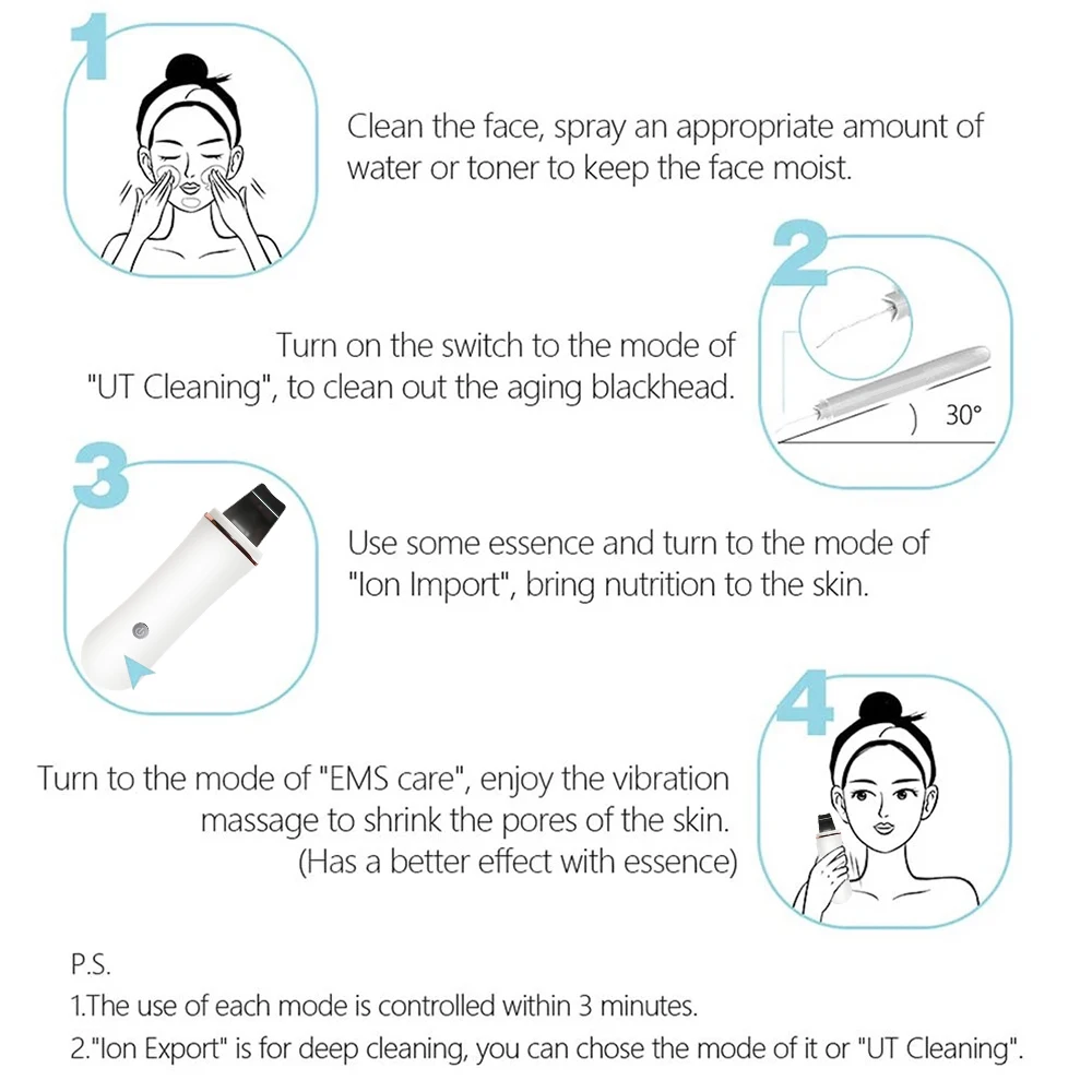 3. Омертвевшая кожа: под действием воды, ультразвуковая вибрационная функция, чтобы удалить омертвевшую кожу, и теперь кожа чистая.