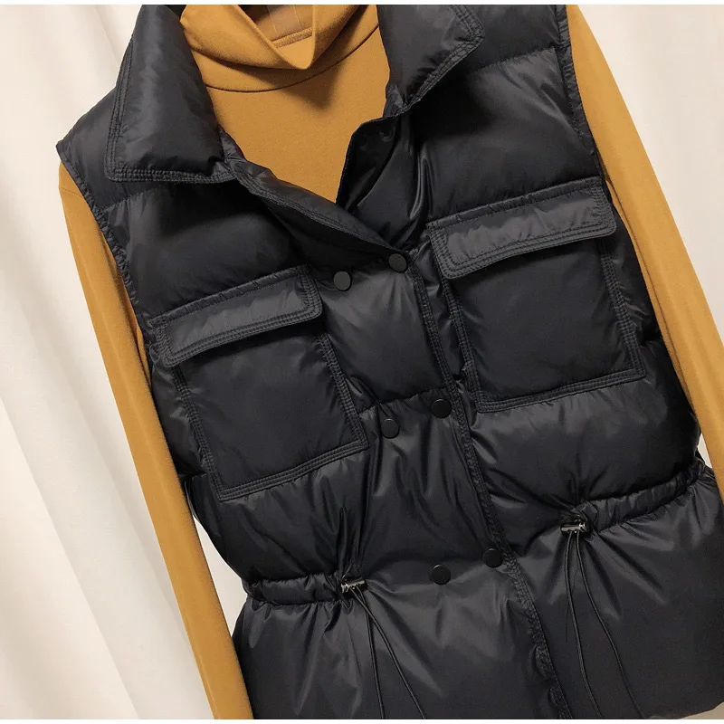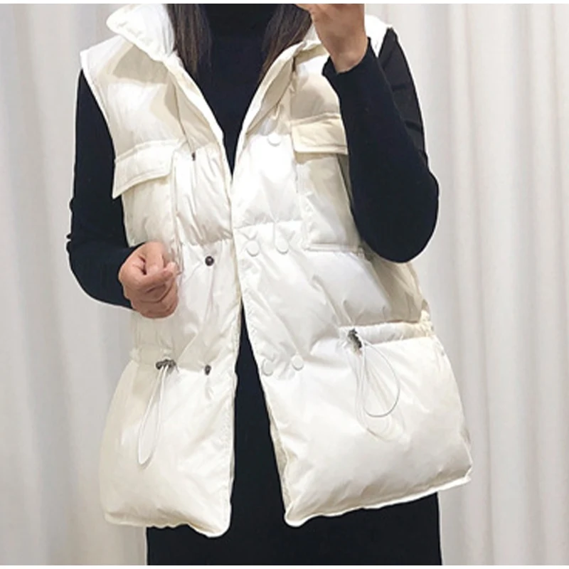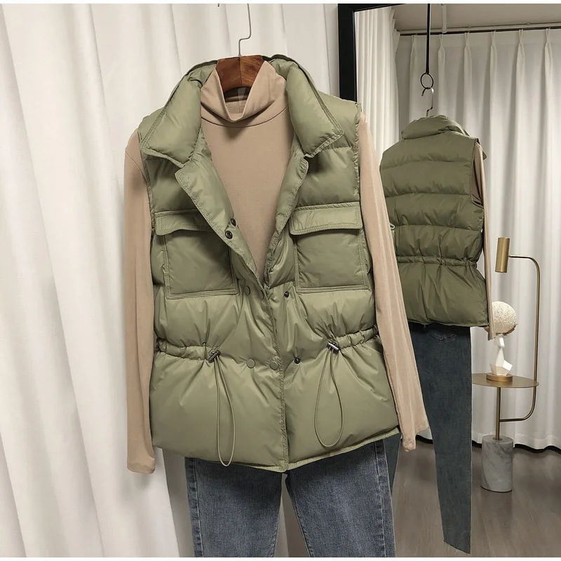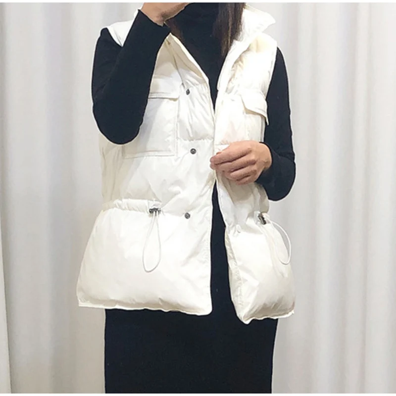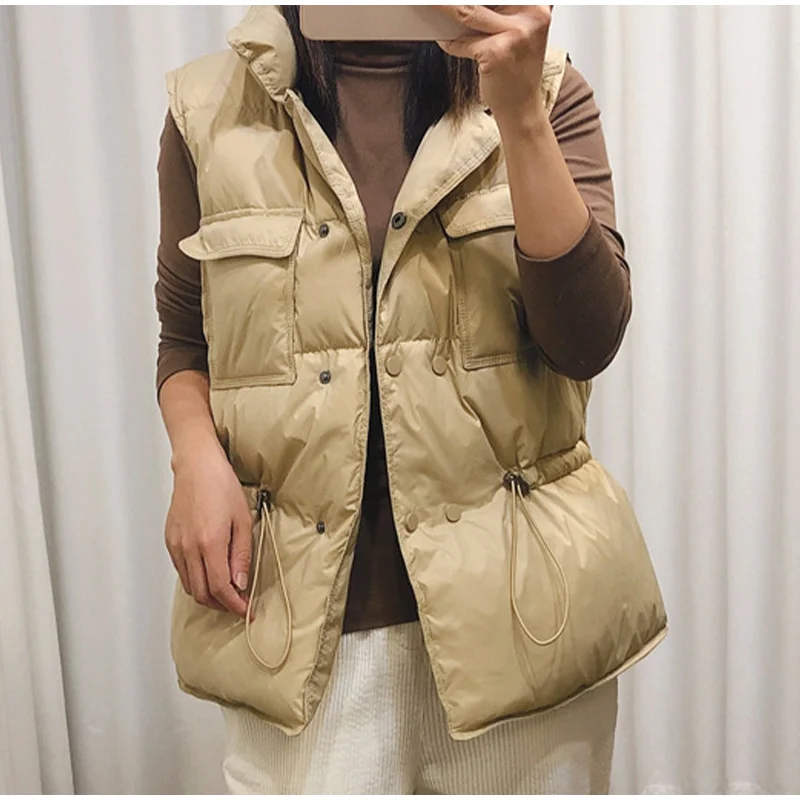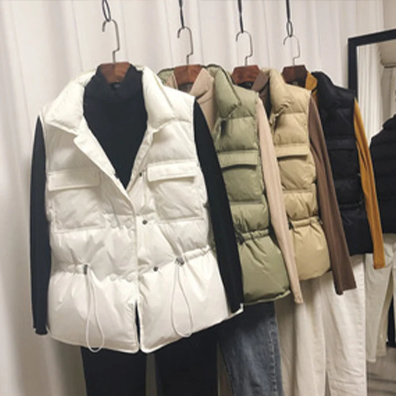 Женская куртка, жилет, белый утиный пух, теплое пальто, с карманами, на завязках, со стоячим воротником, женская верхняя одежда, тонкая, 2021, Зимние Модные топы