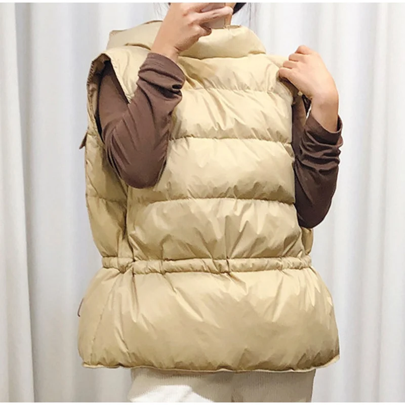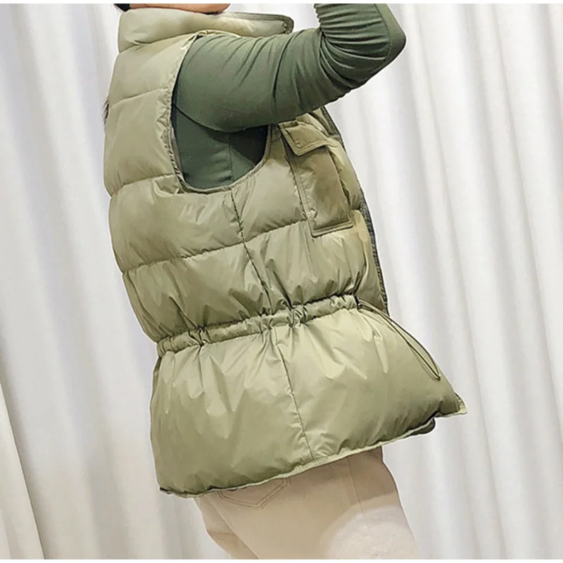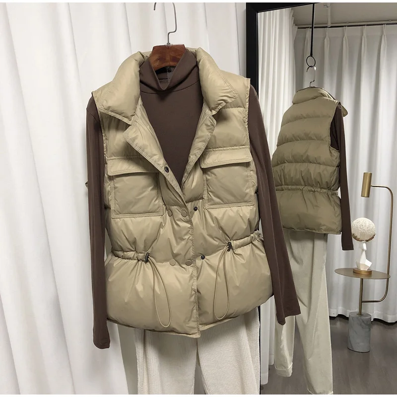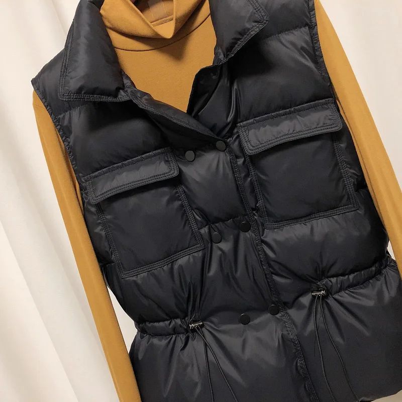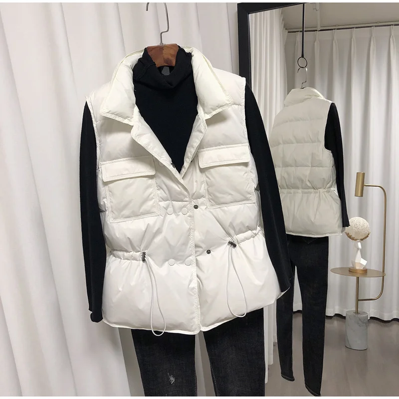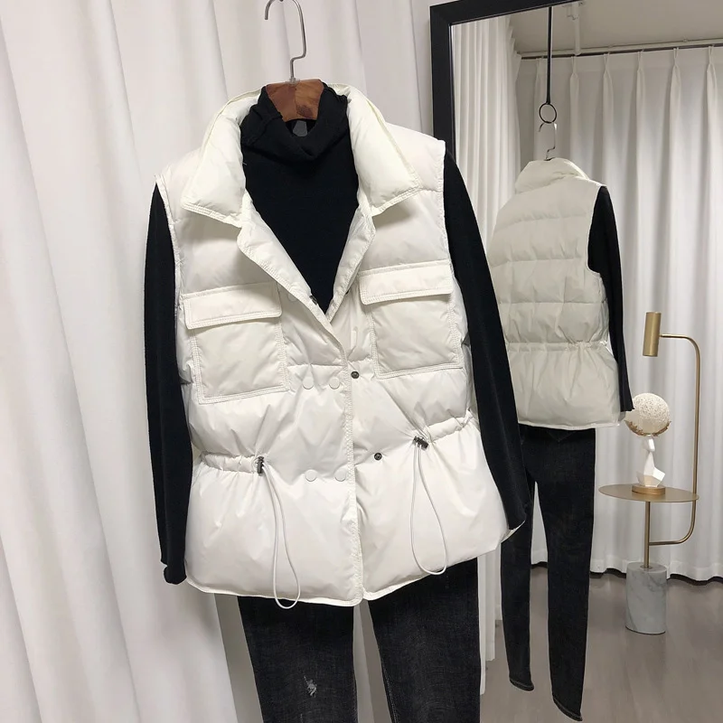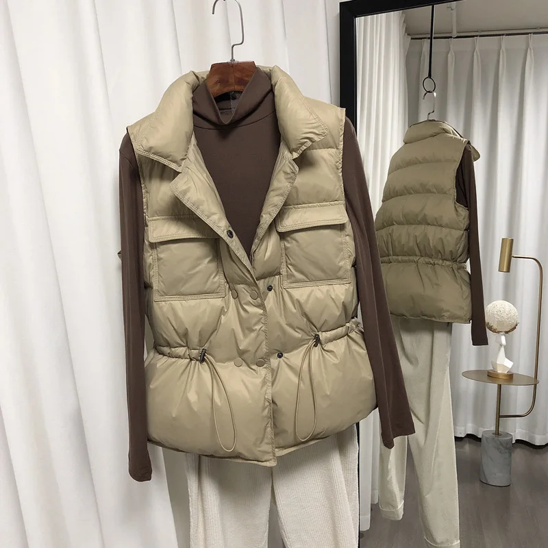 Женская куртка, жилет, белый утиный пух, теплое пальто, с карманами, на завязках, со стоячим воротником, женская верхняя одежда, тонкая, 2021, Зимние Модные топы