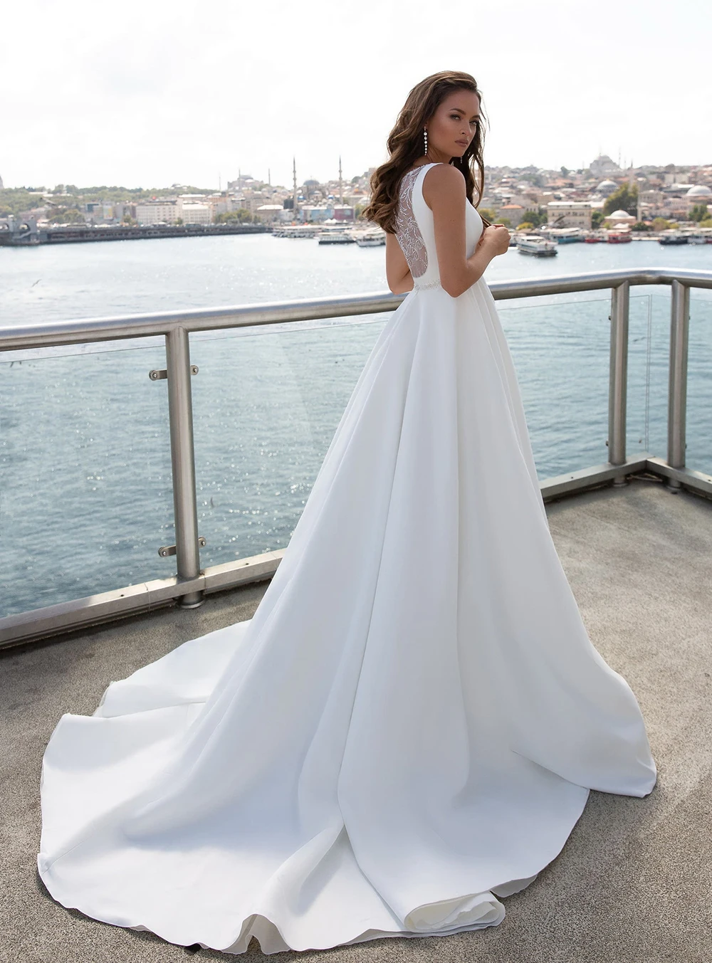 Платье свадебное атласное ТРАПЕЦИЕВИДНОЕ с глубоким круглым вырезом...