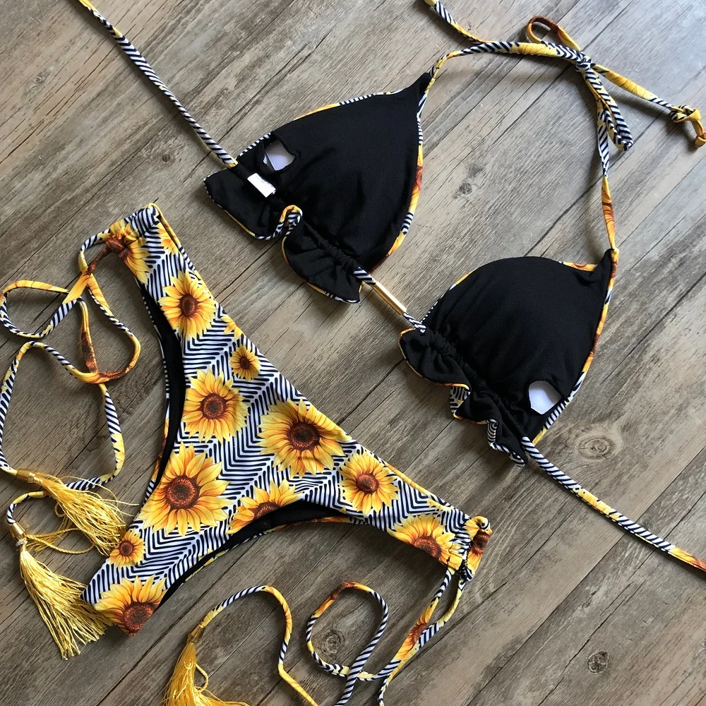 Купальник сексуальный 2022 бикини с цветочным принтом полосатый лоскутный женский бандажный комплект бикини купальник бразильская пляжная одежда новый купальный костюм