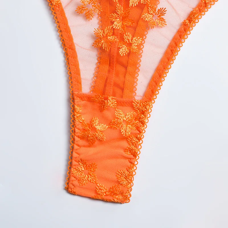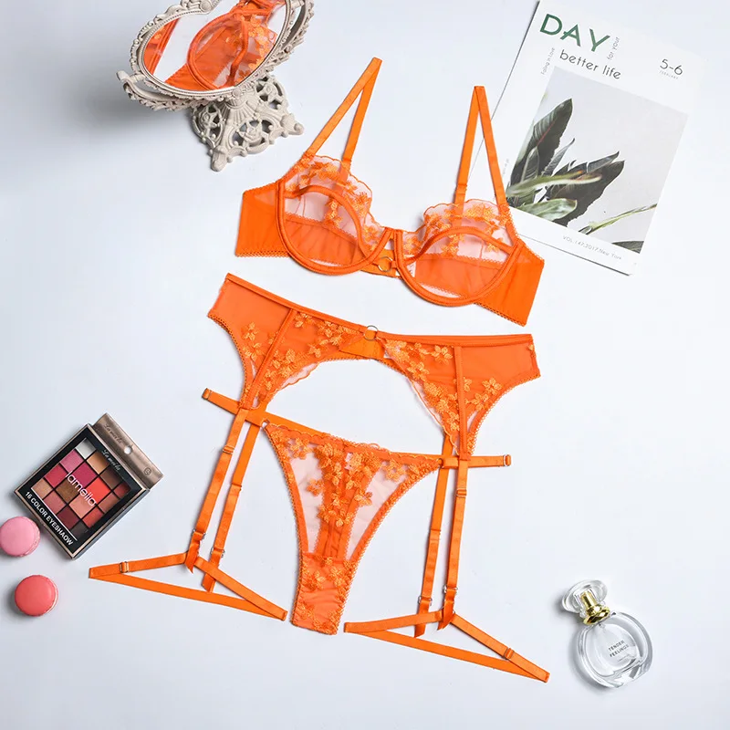 Ellolace кружевное нижнее белье с вышивкой, сексуальное прозрачное нижнее белье, эротический комплект из 3 предметов, оранжевый сетчатый бюстгальтер, комплект для ухода за кожей