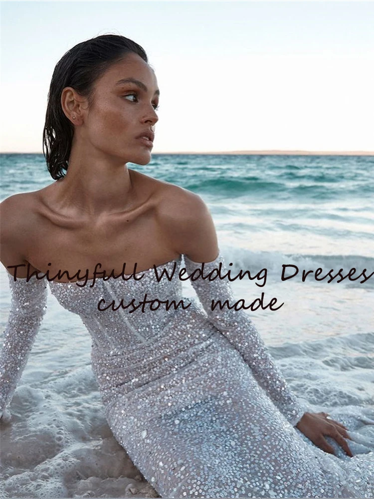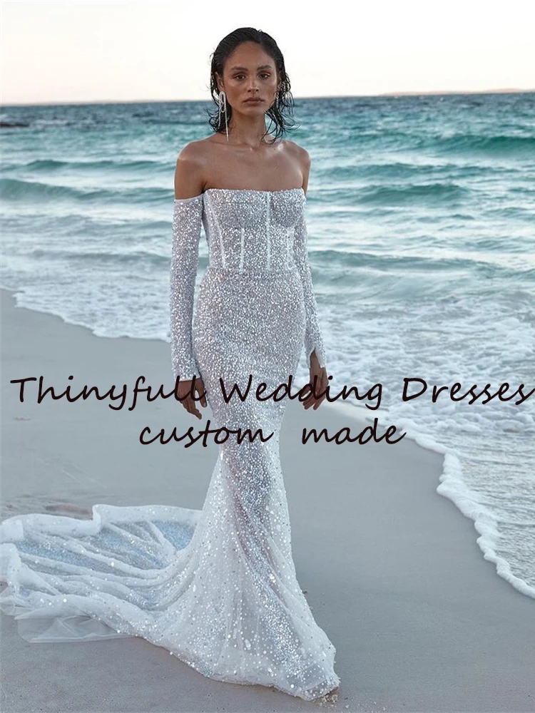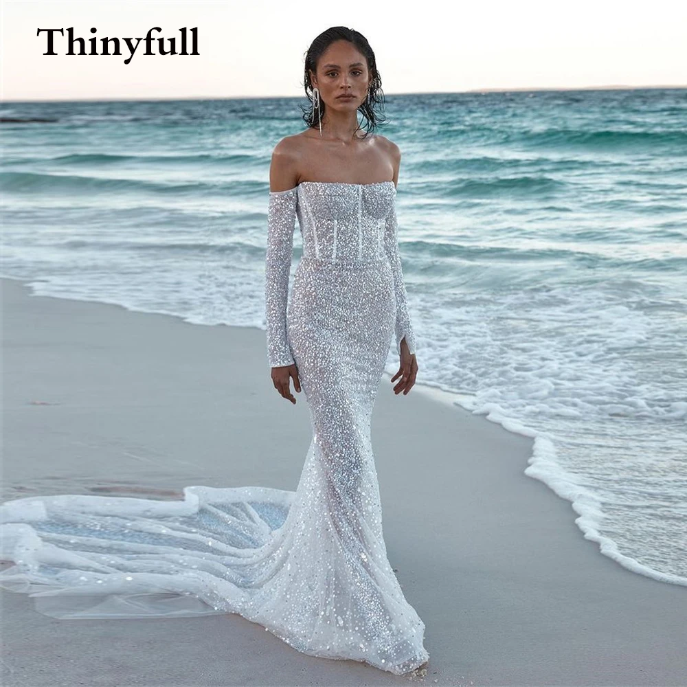 Thinyfull 2022 блестящие Длинные свадебные платья русалки с длинными рукавами без бретелек новые пляжные свадебные платья