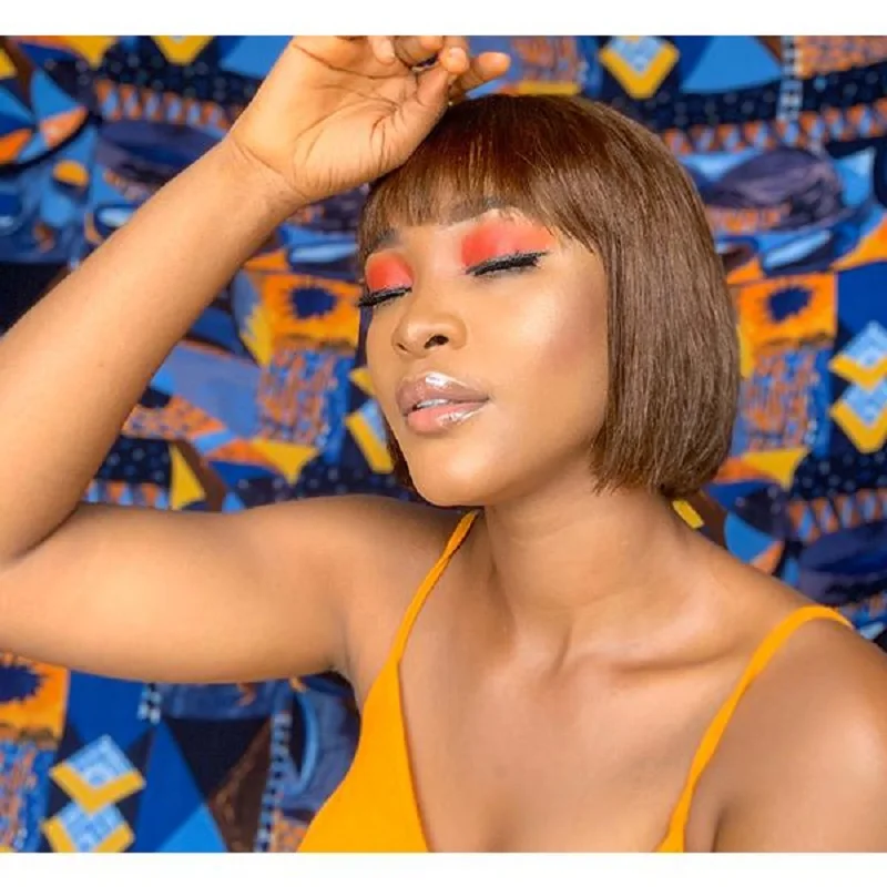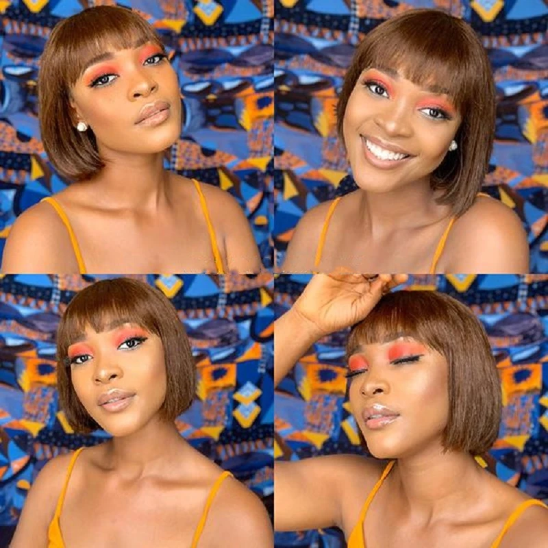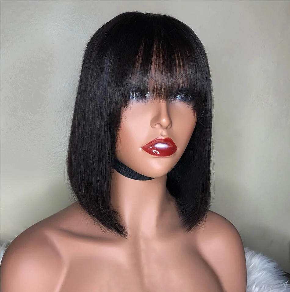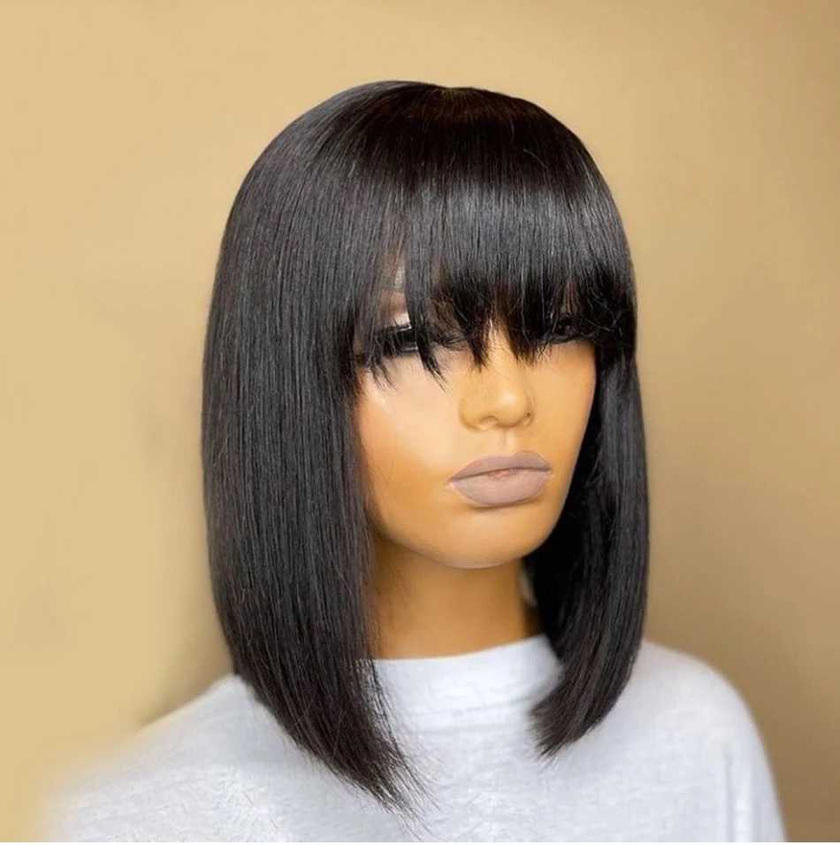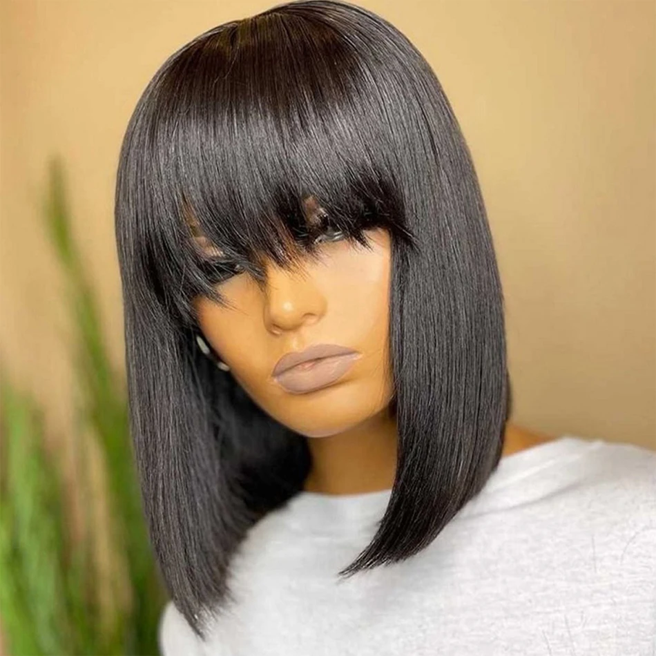 Короткий парик из человеческих волос Боб с челкой, бахрома, дешево, полностью машинное изготовление, без клея, для черных женщин, прямой девственный бразильский вырез фея