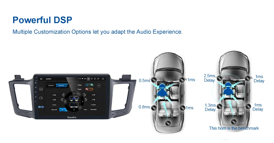 Стереофонического сигнала для автомобиля с сенсорным экраном имеет встроенный DSP 30-полосным эквалайзером и ST7708 4*50 Вт усилитель выход. Несколько вариантов настройки: Pop, Rock, Jazz, Classic, Flat, User, Voice и т. д.