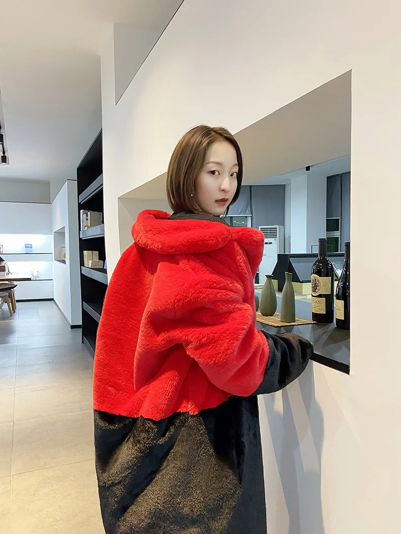 Женское пальто из искусственного меха норки контрастных цветов, зим...