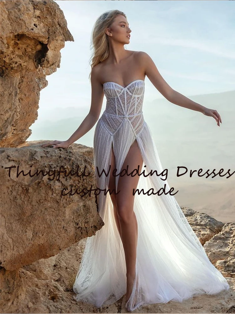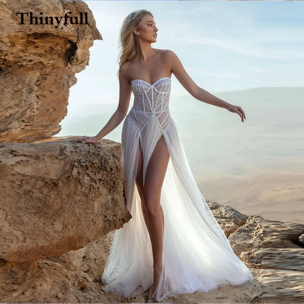 Модные блестящие пляжные свадебные платья с юбкой-годе без рукавов с высоким разрезом сбоку платье для сердца свадебные платья в стиле бохо вечерние нее платье принцессы