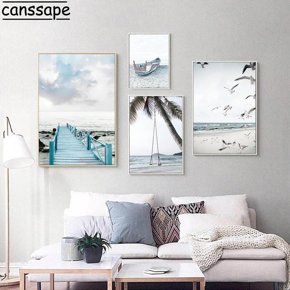 Плакат с пляжным пейзажем Чайка Холст Картина Пальма Художественная печать Лодка на стену искусство скандинавский настенный Декор Гостиная плакаты
