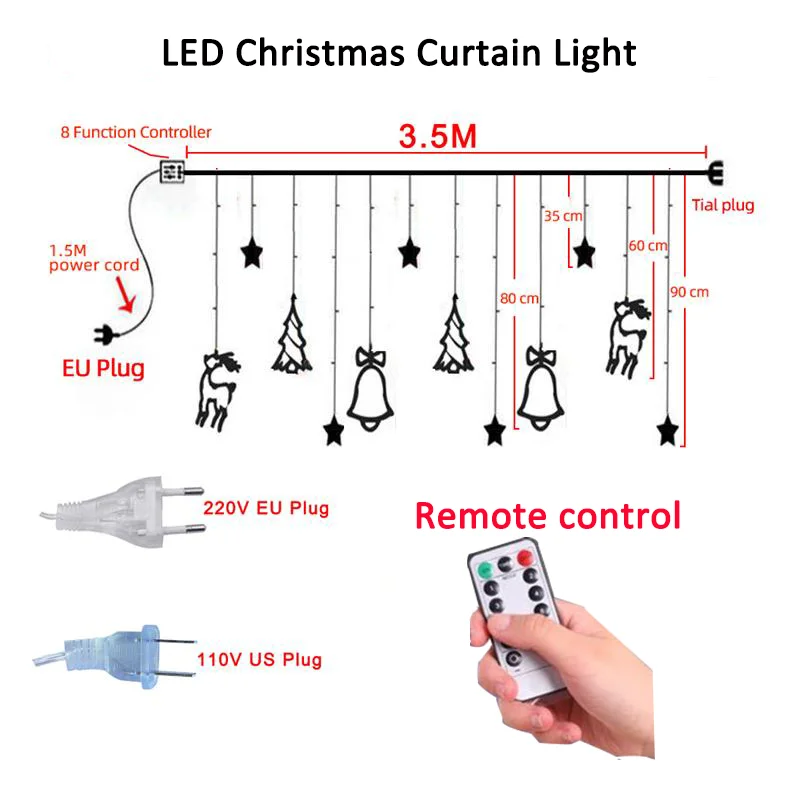 2. 11.5ft Гирлянда для занавесок со звездами: эксклюзивный для Рождества и нового года, 138 светодиодов, 12 рождественских украшений (2elk, 6 звезд, 2 колокола, 2 дерева),