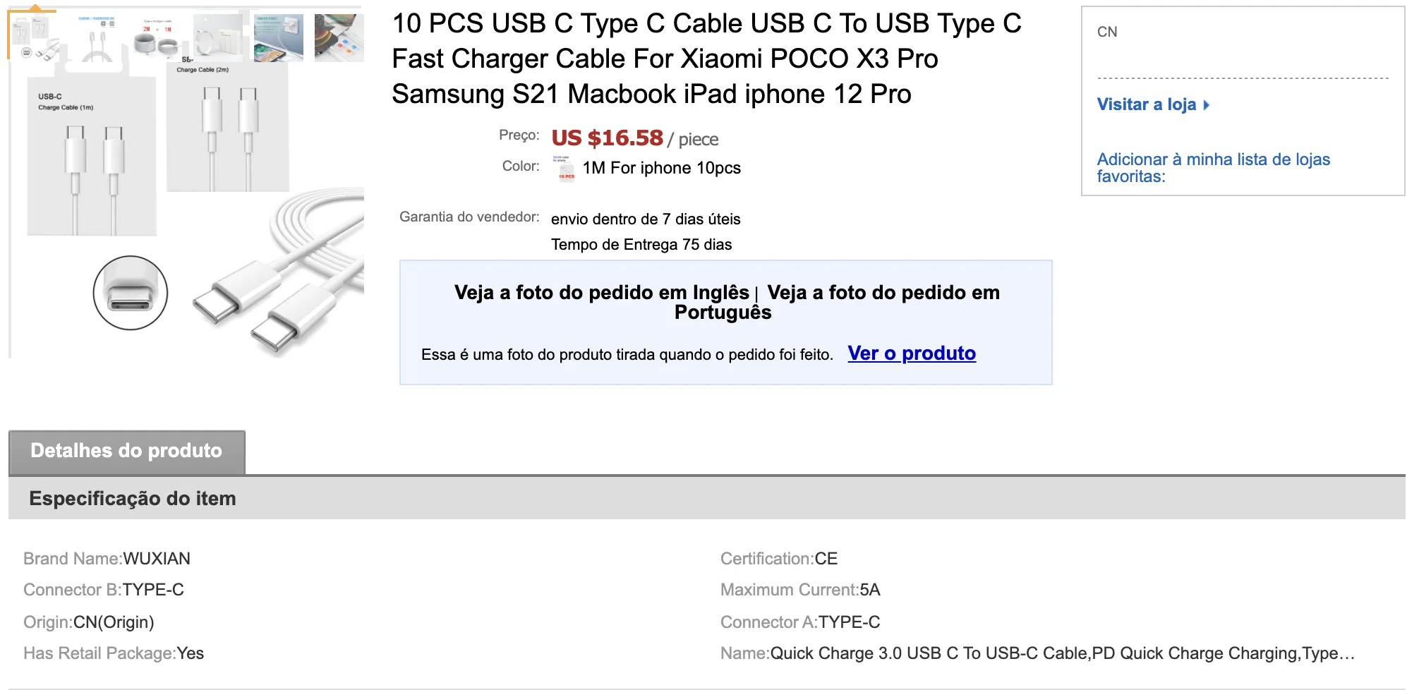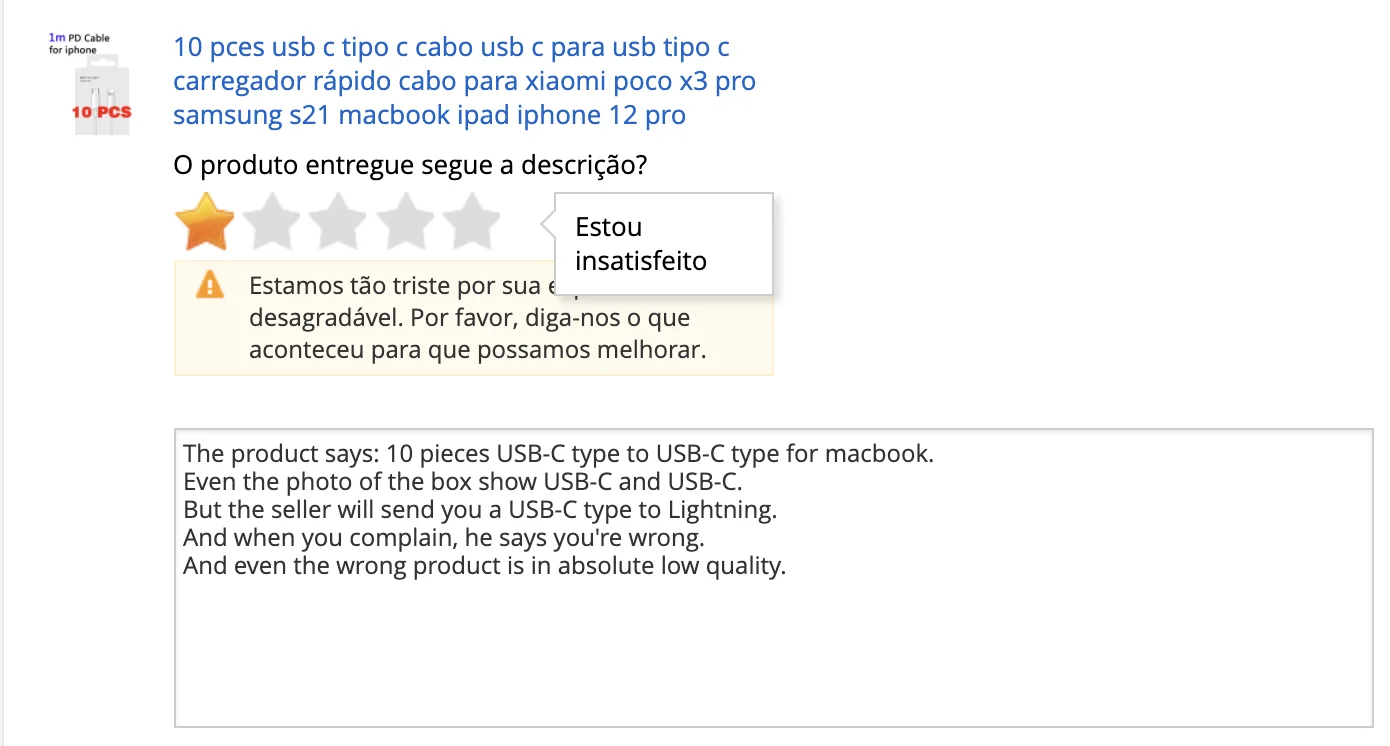 В описании товара: 10 шт. USB-C типа на USB-C для macbook. Даже Фотография Коробки показывает USB-C и USB-C. Но продавец отправит вам USB-C тип на Lightning. И когда вы жалуетесь, продавец отказывается принять это. И даже неправильный продукт в абсолютном низком качестве.