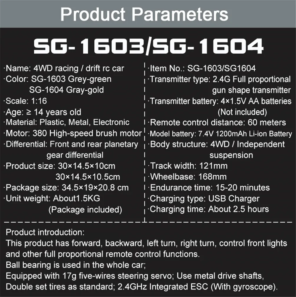 Модель гоночного автомобиля SG 1604 RTR 116 2,4G 4WD 30 кмч, со светодиодный светильник кой