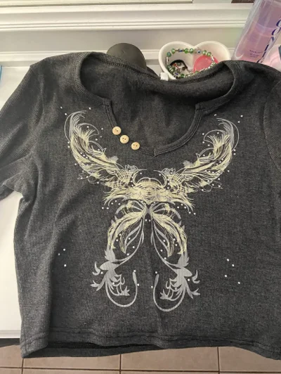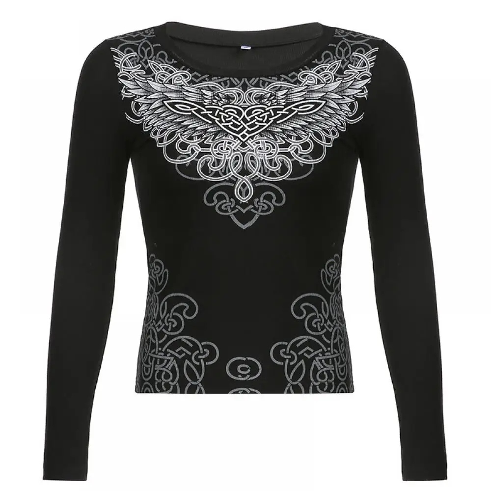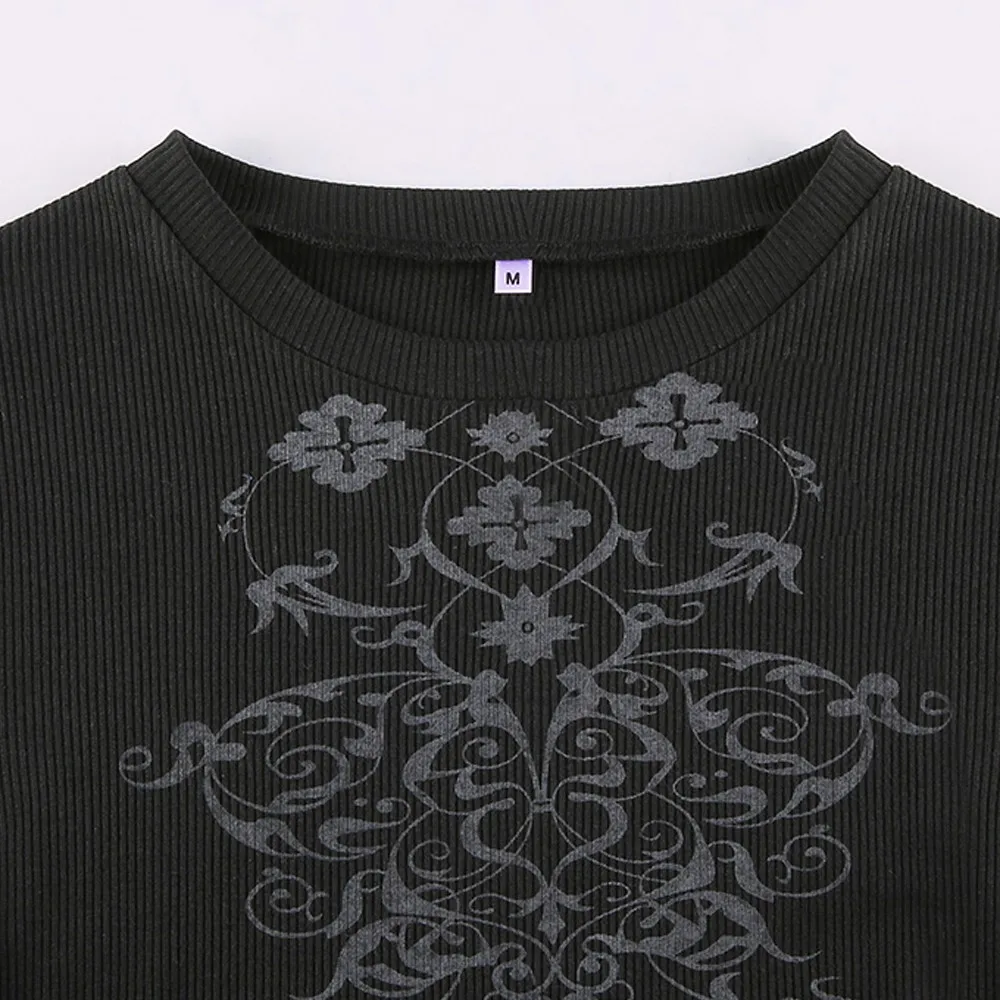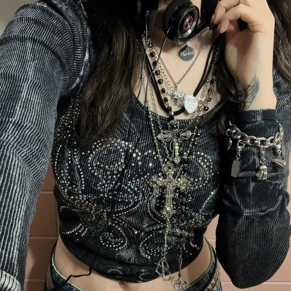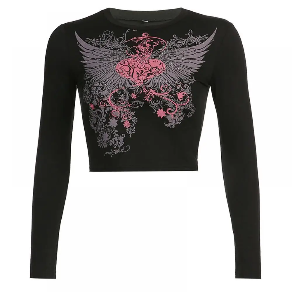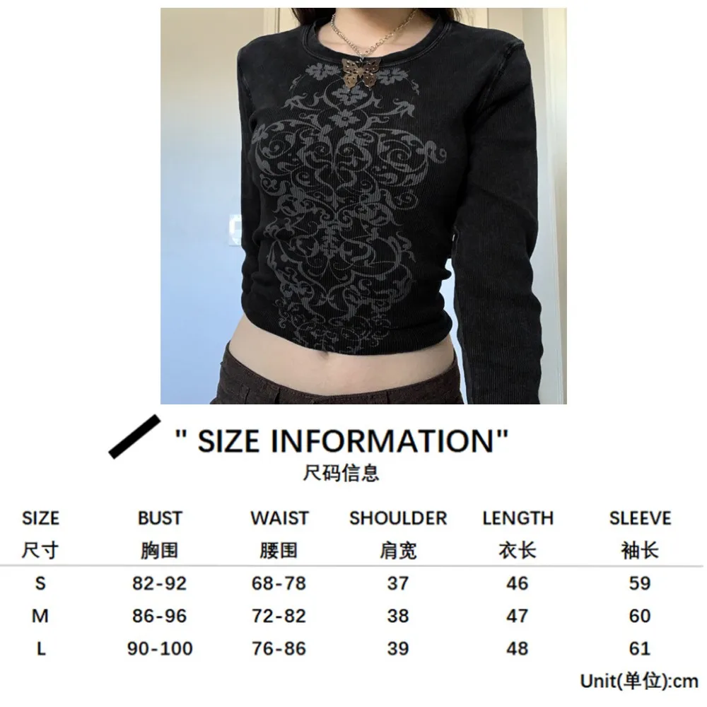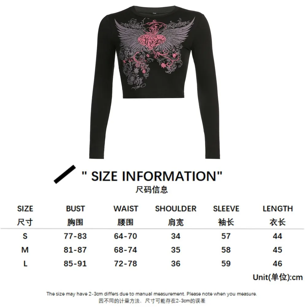 Укороченные футболки с графическим принтом в стиле ретро Y2K, винтажная одежда в стиле Харадзюку, гранж-фея, в стиле 90-х, Осенние укороченные топы с длинным рукавом и V-образным вырезом