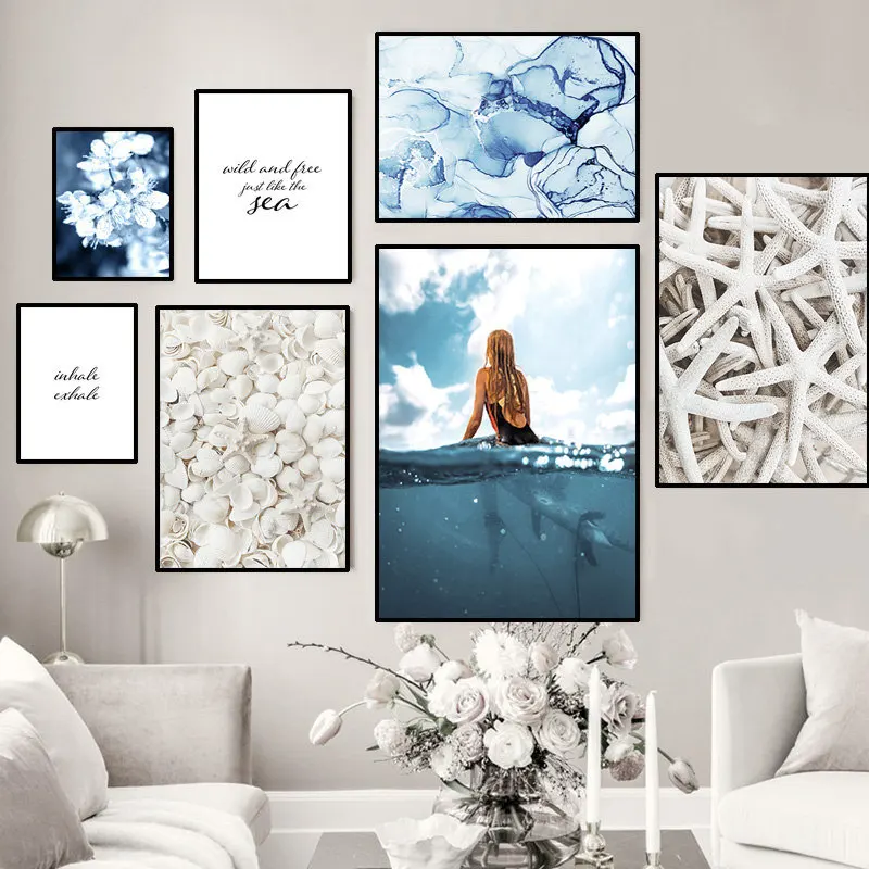 Серфинг девушка цветы печать и плакат оболочка Холст Картина синий океан Морской пейзаж абстрактная Спальня Настенная картина Декор HD0125