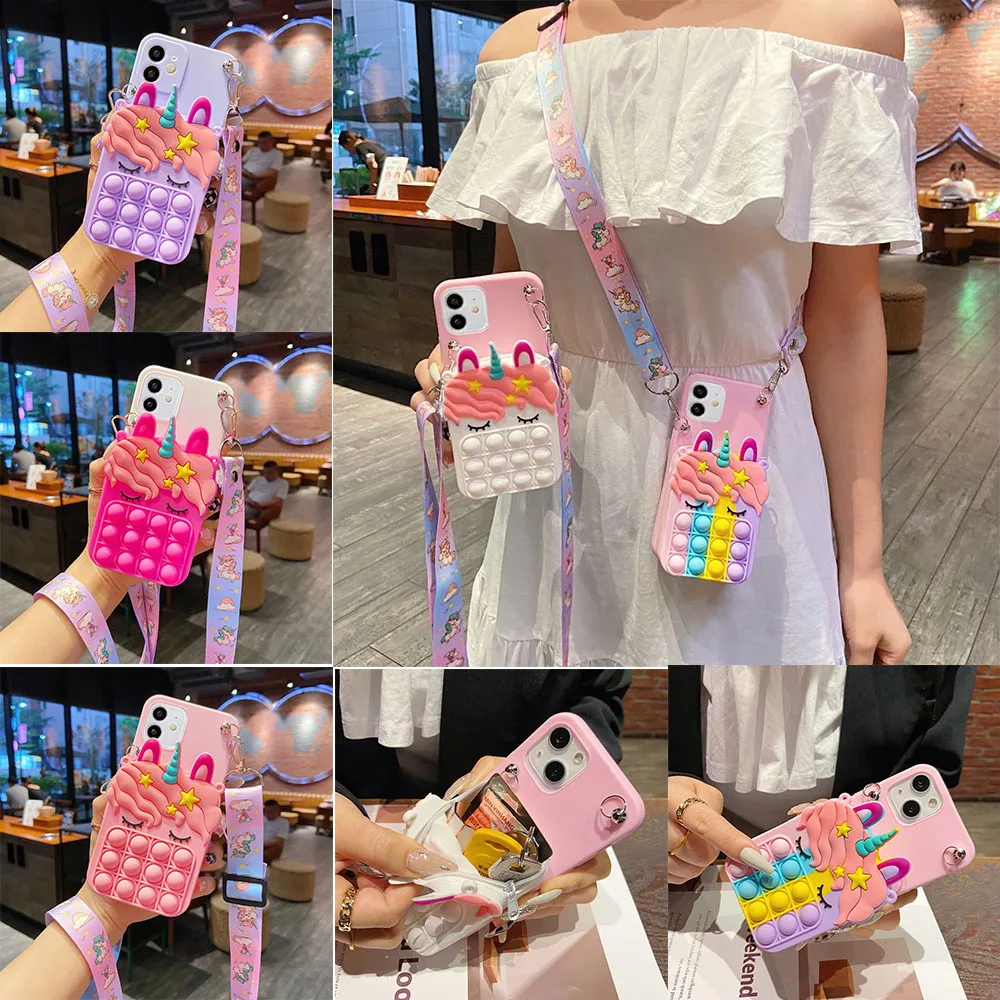 Features3D Cartoon Rainbow Unicorn Coin Purses Wallet Case Soft Silicone Relieve Stress Holder Cover with Neck Strap Rope Lanyard