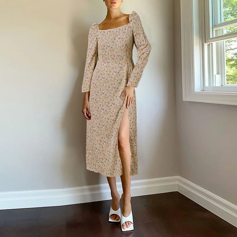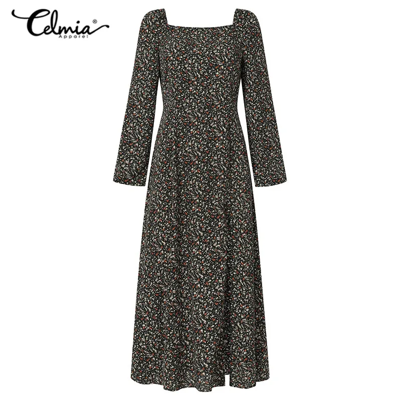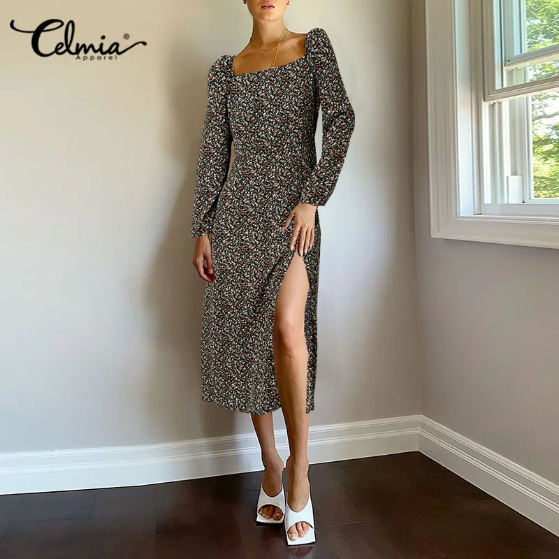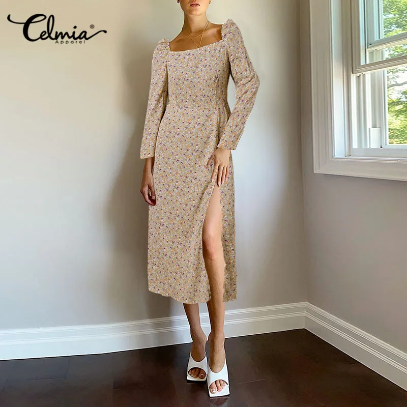 Женское винтажное платье Celmia, осень 2022, пикантный сарафан с высоким разрезом, повседневное длинное платье с квадратным вырезом, халаты