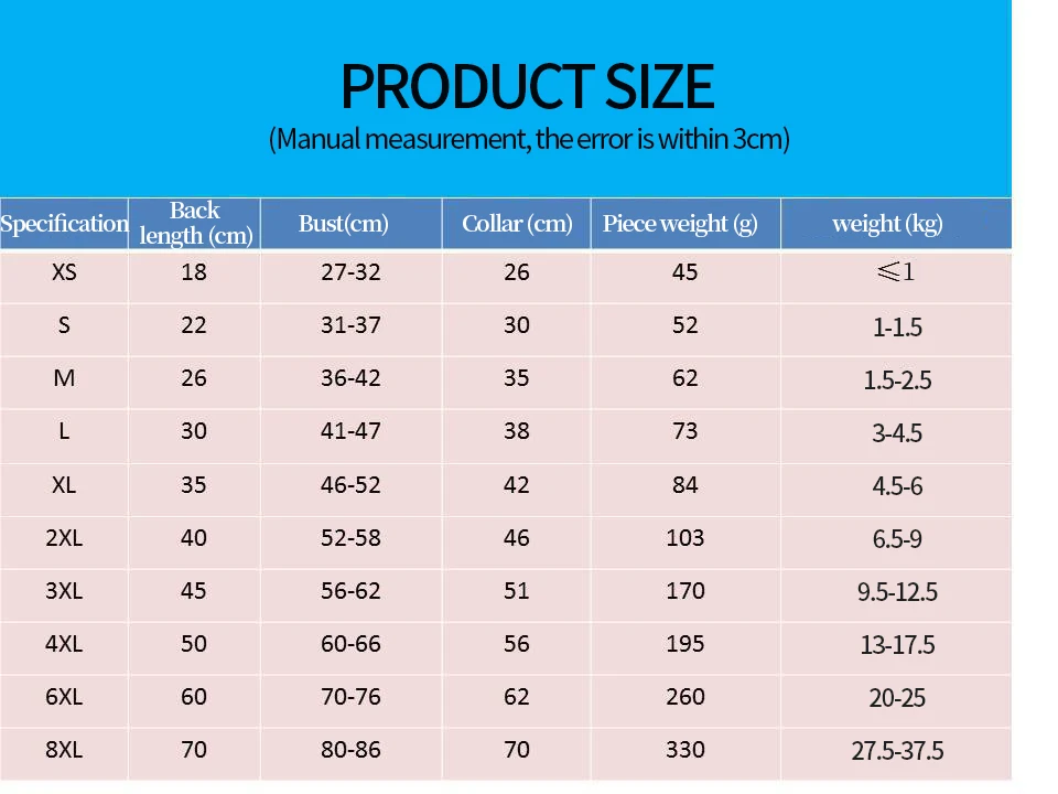 SizeXS (recommended less than 2 kg), S (recommended 2-3 kg), M (recommende