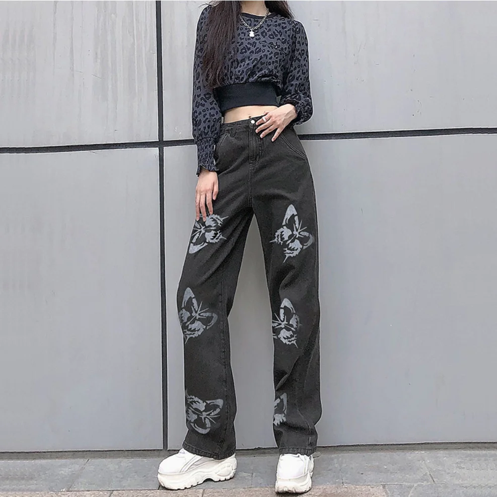 Джинсы женские, широкие, с высокой талией, с принтом бабочек
