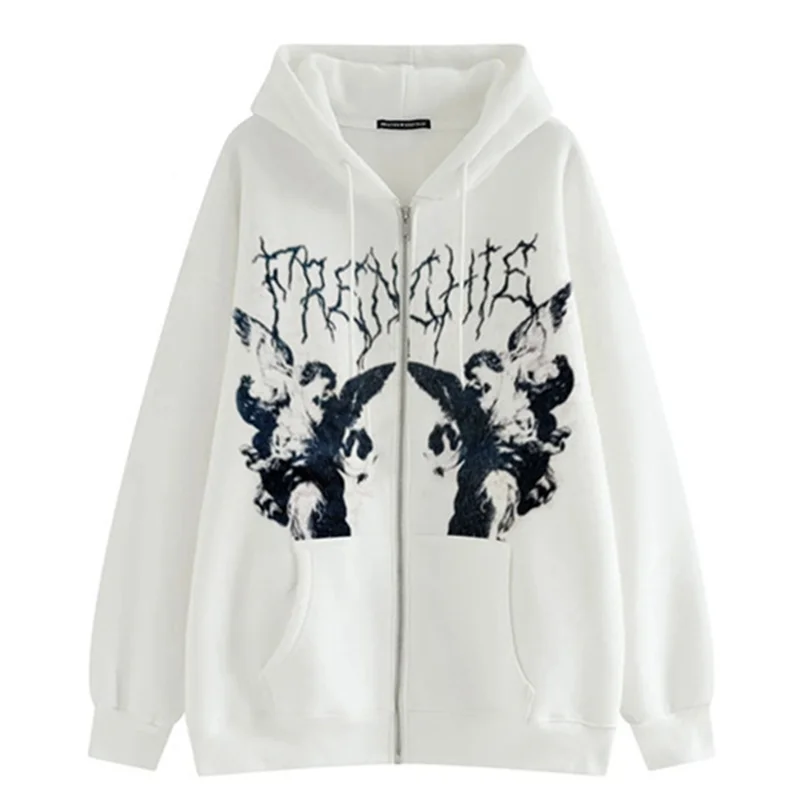 Куртка с капюшоном и принтом ангелов для мужчин и женщин, винтажная уличная одежда на молнии, с длинным рукавом и карманами, свободные худи, Y2K, Осень-зима