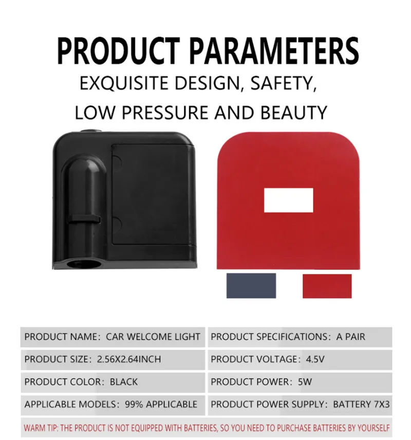 Подходит для:Универсальный логотип для автомобиля Особенности:1. Этот светильник без дрели Ghost Shadow не является беспроводным, он специально разработан для автомодификации fancier, и он не разрушит оригинальный внешний вид автомобиля, что принесет больше удовольствия водителям.2. Ослепляющий светильник с логотипом и сигнальный светильник будут отображаться на земле, когда вы откроете дверь автомобиля, и он выключится при закрытии двери.3. Может быть установлен в обоих влево или вправо двери, любезно дверь светильник делает ваш автомобиль художественно. Характеристики:Цвет: черныйМатериал: АБС-пластикПитание: 3 аккумулятора AAA (не входят в комплект). Установки:Простая установка, не нужно просверливать отверстие, просто приклейте светильник на дверную панель и приклейте магнит в нижней части рамы автомобиля. Никакого вреда для вашего автомобиляПосылка: