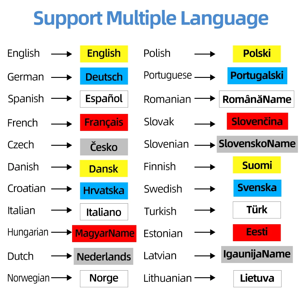 Чешский, датский, немецкий, английский, испанский, французский, хорватский, итальянский, венгерский, голландский, норвежский, польский, португальский, румынский, словацкий, словенский, финский, шведский, турецкий, эстонский, латышский, литовский