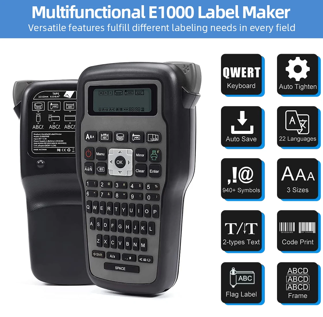 3. Подходит для широкого спектра этикеток: этикетка E1000 совместима с лентами Brother P-Touch TZe и промышленными этикетками 6 мм, 9 мм, 12 мм в различных материалах и цветах, таких как ламинат/кабель/термоусадочная трубка/лента/Безопасность/ПЭТ/ткань и т. д.;