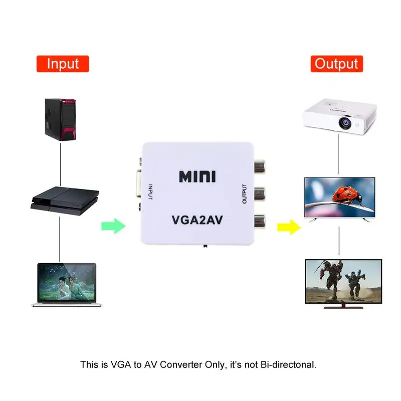 Видео конвертер AV2VGA сделает возможным подключение устройства свыходом RCA к устройству с входом VGA. Преобразователь имеет дополнительныйвход для звука 2 RCA и аудиовыход Jack 3.5 мама. Конвертация из VGA непроизводится. Для работы требуется подключение внешнего питания DC 5V. Вкомплекте поставляется провод для подключения питания. Преобразователь RCA toVGA является однонаправленным, т.е. конвертация сигнала происходит только водном направлении. В обратную сторону конвертер работать не будет.
