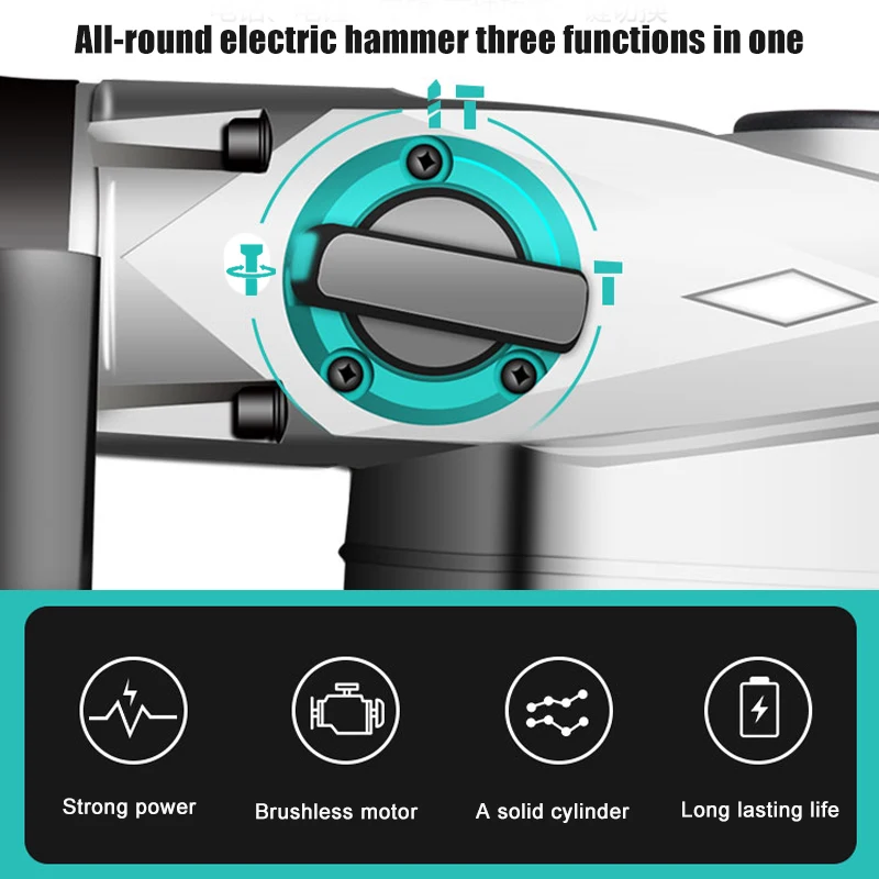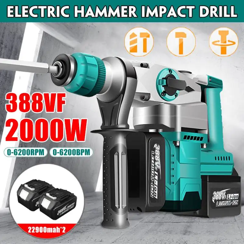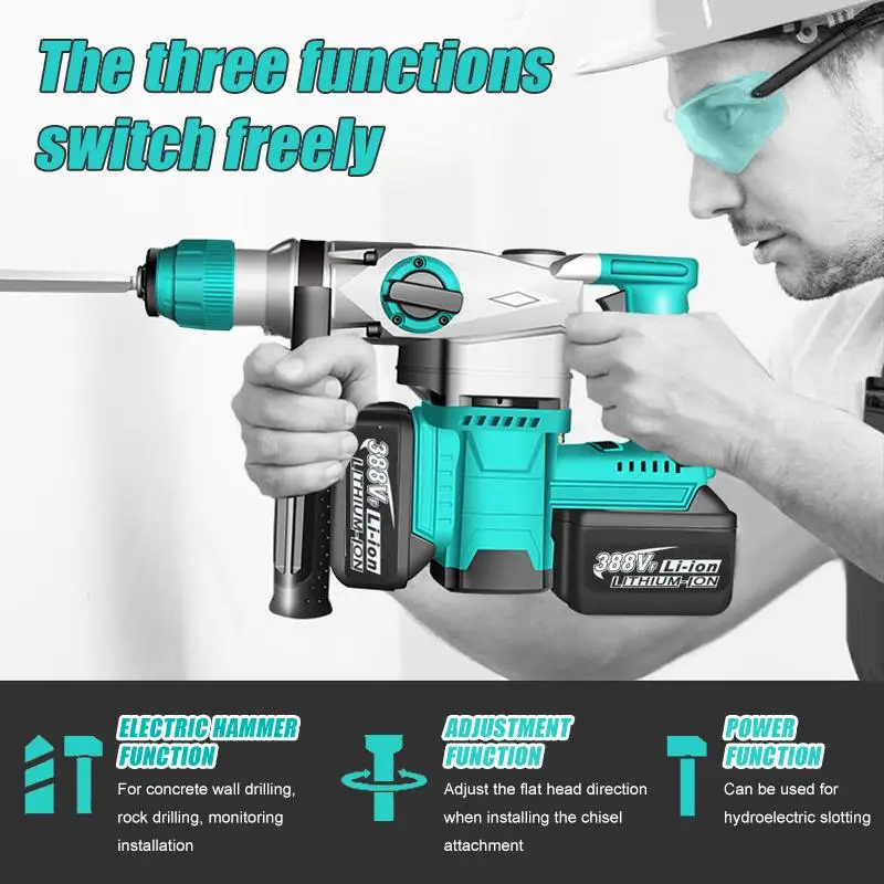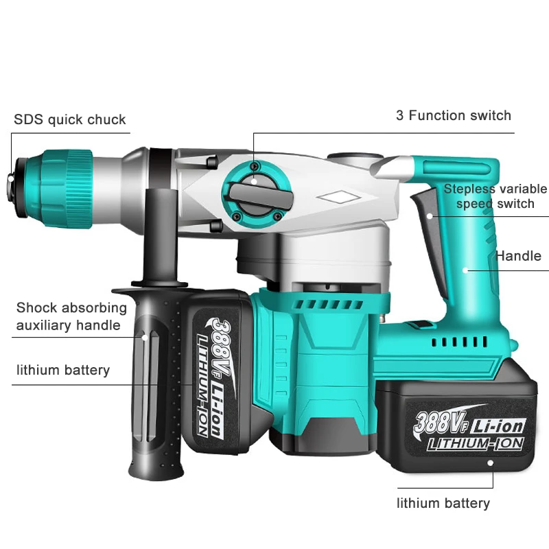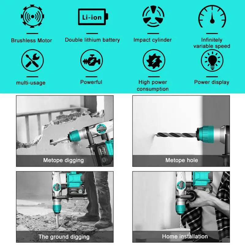 Особенности:-Большая емкость литиевой батареи, длительный срок службы, четыре интеллектуальных качественных элемента защиты-Бесступенчатая скорость, принцип автоматической передачи автомобиля, переключатель регулирует скорость вала и крутящий момент машины-Круглый Электрический молот три функции в одном-Подходит для строительных площадок, технического обслуживания, деревообработки и т. Д.-Бесщеточный двигатель не генерирует искры, когда он работает, и двигатель не изнашивается.-Вторичная ручка 360 °, операция гладкая, и Рабочая осанка может быть скорректирована по желанию, чтобы адаптироваться к различным потребностям работы-Беспроводное управление, избавление от системы «line» легко, легкий и портативный