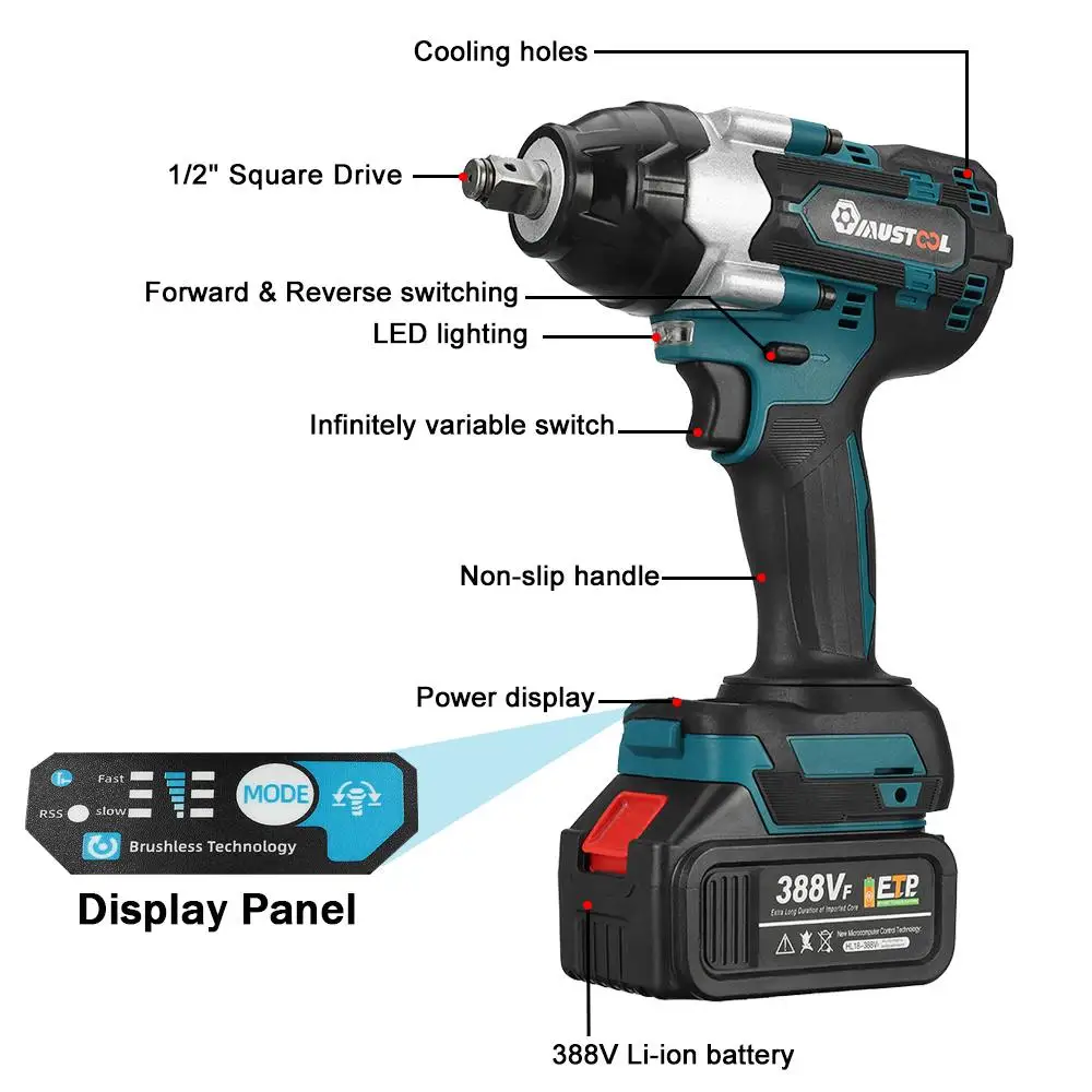 Особенности:-1700N.M высокий крутящий момент, плавное переключение скорости.-Мощный электрический гаечный ключ, многоцелевой, супер мощный.-Вал из вольфрамовой стали, высокая твердость и износостойкость.-Подходит для строительных площадок, технического обслуживания, деревообработки и т. Д.-Бесщеточный двигатель не генерирует искры, когда он работает, и двигатель не изнашивается.-Светодиодный светильник.