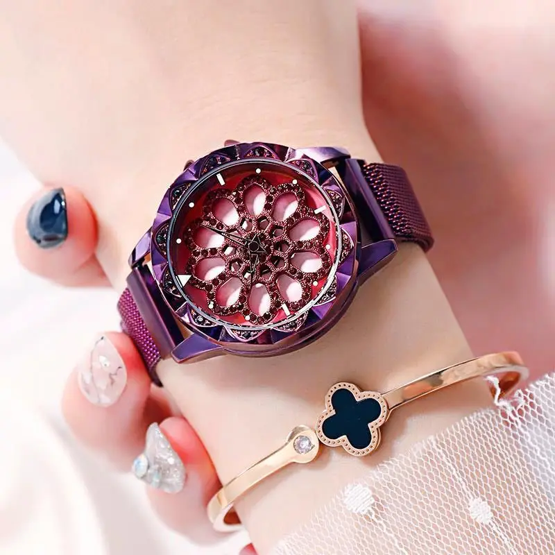 Прямая поставка, роскошные магнитные часы, дизайн с вращающимся циферблатом 360, часы на удачу, браслет из нержавеющей стали, кварцевые часы, женские часы