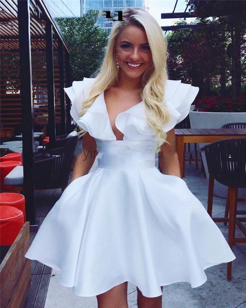 Белое коктейльное платье с рюшами, глубоким V-образным вырезом и карманами