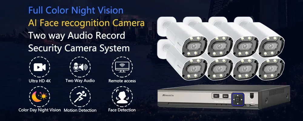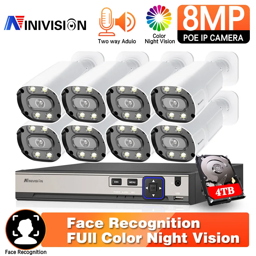 4K 8CH NVR система обнаружения лица комплект безопасности POE Водонепроницаемая HD 8MP IP двухсторонняя аудио пулевая камера комплект видеонаблюдения