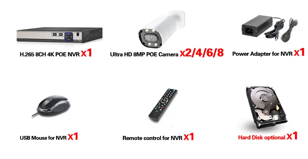 1 сетевой видеорегистратор 8CH 4K POE NVR;2/4/6/8 X HD POE IP 8.0MP для дома и улицы ИК Ночного Видения Всепогодные камеры;1 X Блок питания для NVR;1 х USB мышь для NVR;1 компакт-диск программного обеспечения для NVR;1 пульт дистанционного управления для NVR;Жесткий диск опционально!