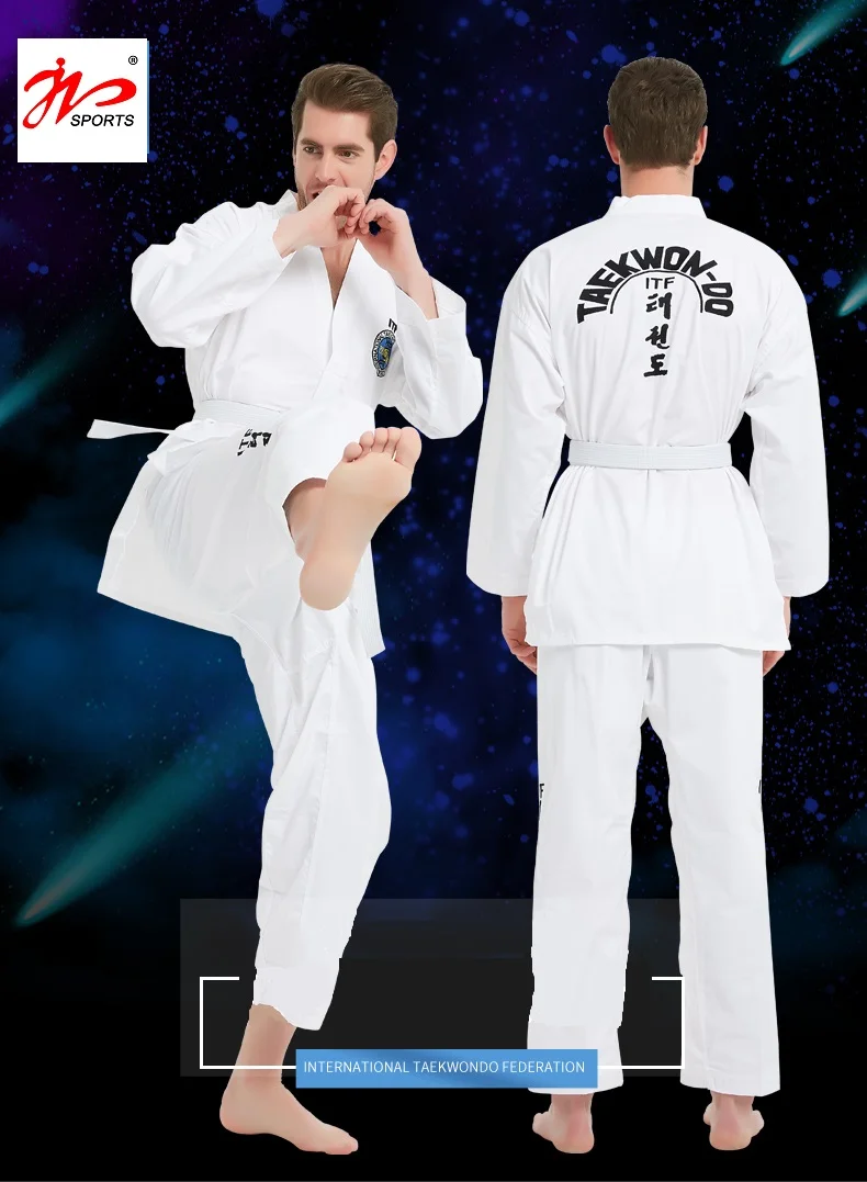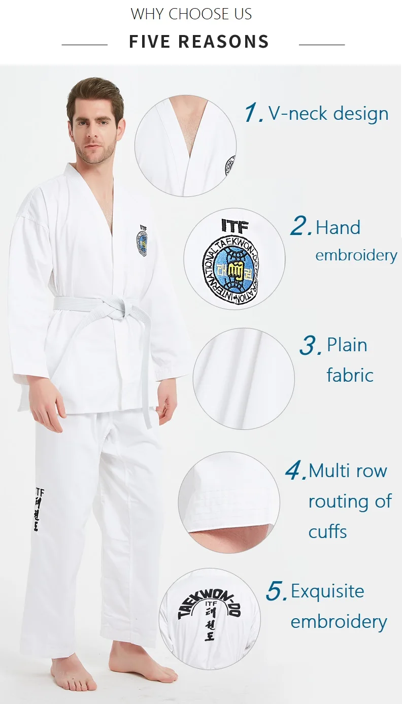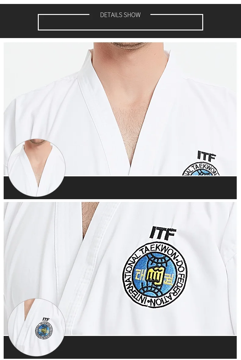 Этот даосский костюм является стандартным ITF костюм тхэквондо. Все логотипы ITF расшиты, не дешевая шелковая трафаретная печать.