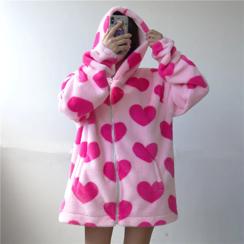 Женские толстовки большого размера, милые Куртки в стиле "Лолита" с капюшоном в форме сердца на молнии, Милая зимняя верхняя одежда для девочек, теплая мешковатая куртка в стиле Y2k