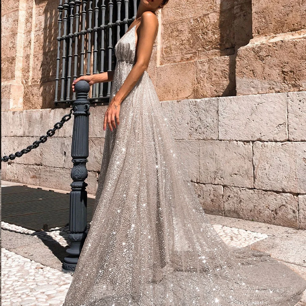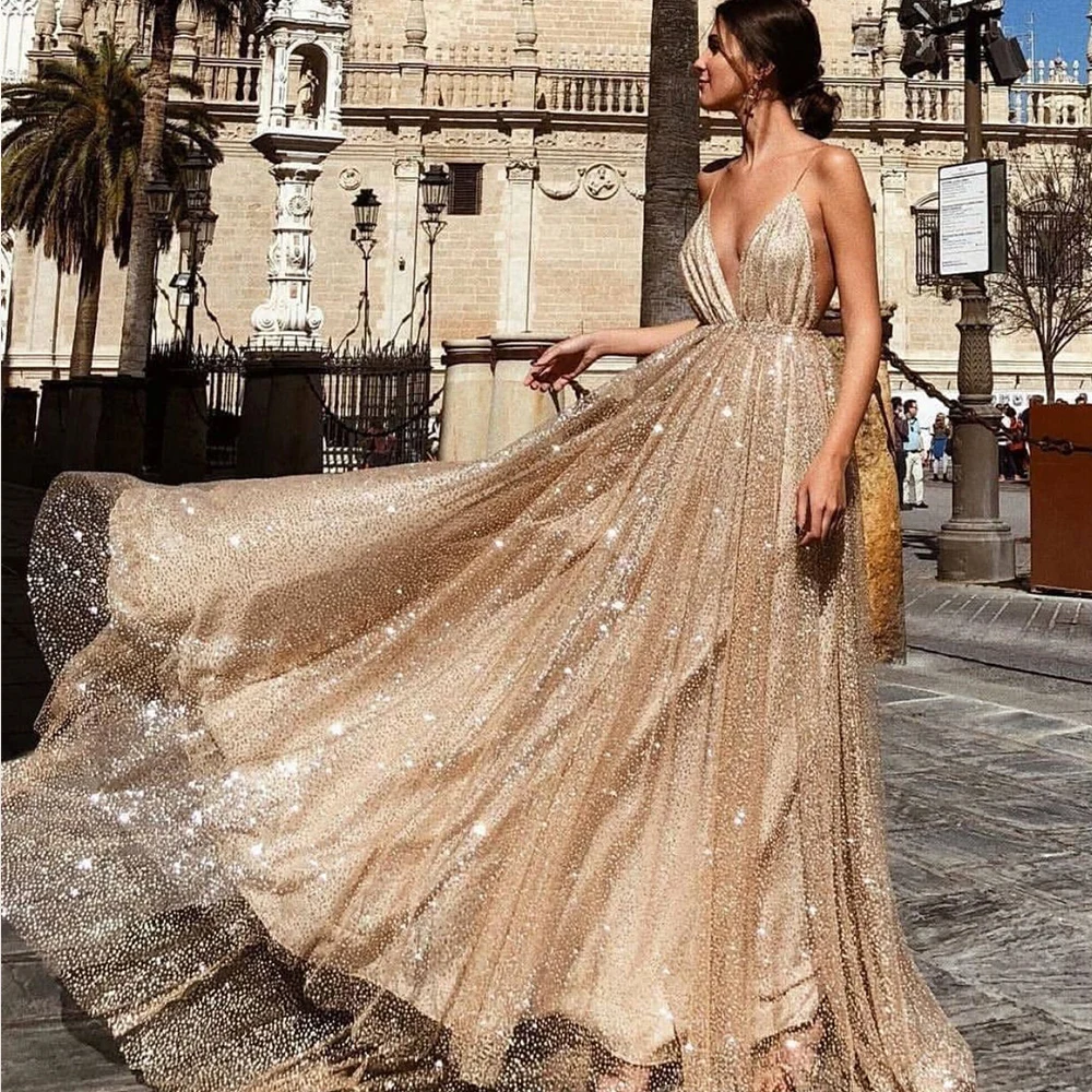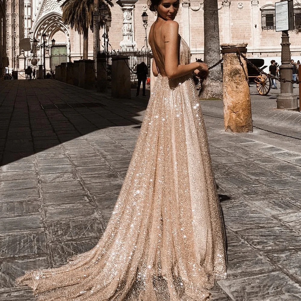 Женское платье с открытой спиной, V-образным вырезом и блестками