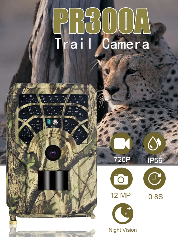 * 1.The фотоловушка, PR300A призвана предложить пользователю наиболее простых в использовании опыт с необыкновенными функциями, как, например, 120 градусов угол обзора объектива 49 шт. ИК-светодиодов, 0,8 S Время срабатывания, до 3 фотографий, 10S видео файл на триггер.