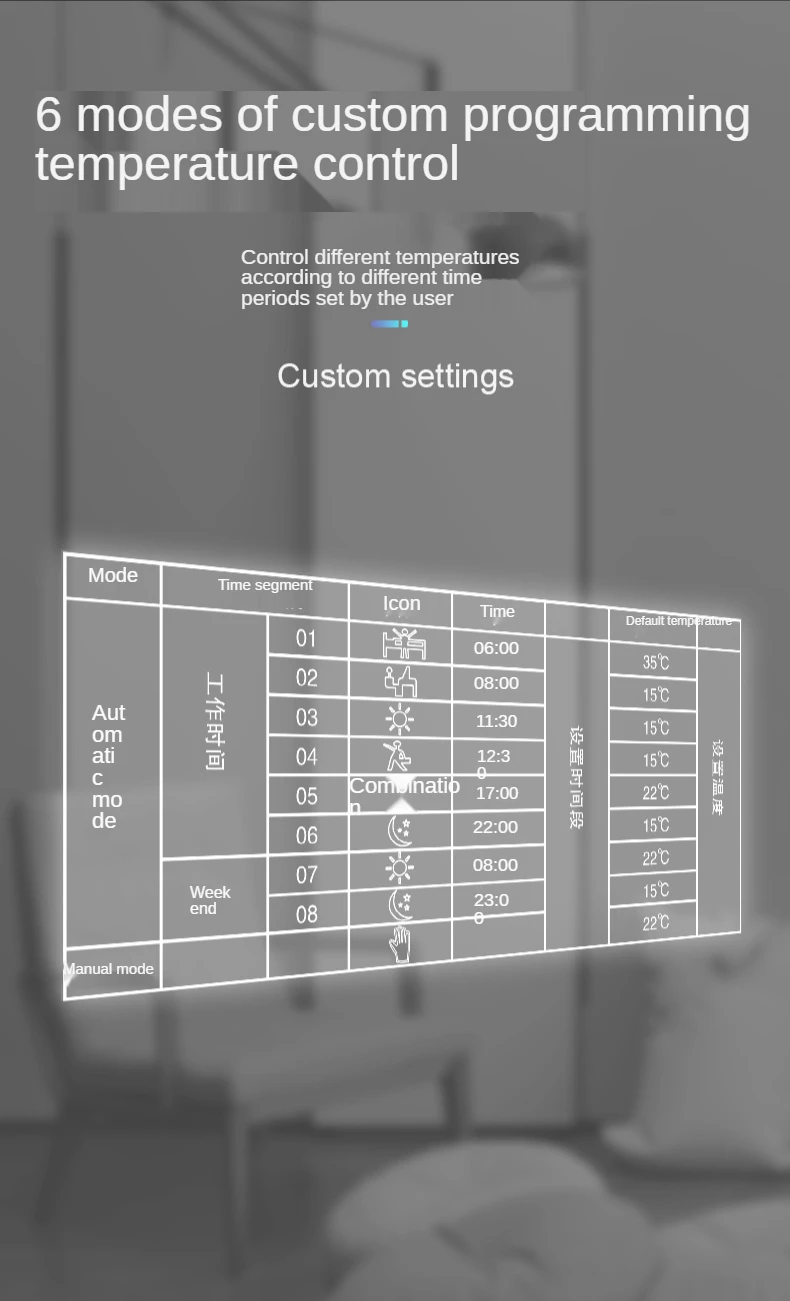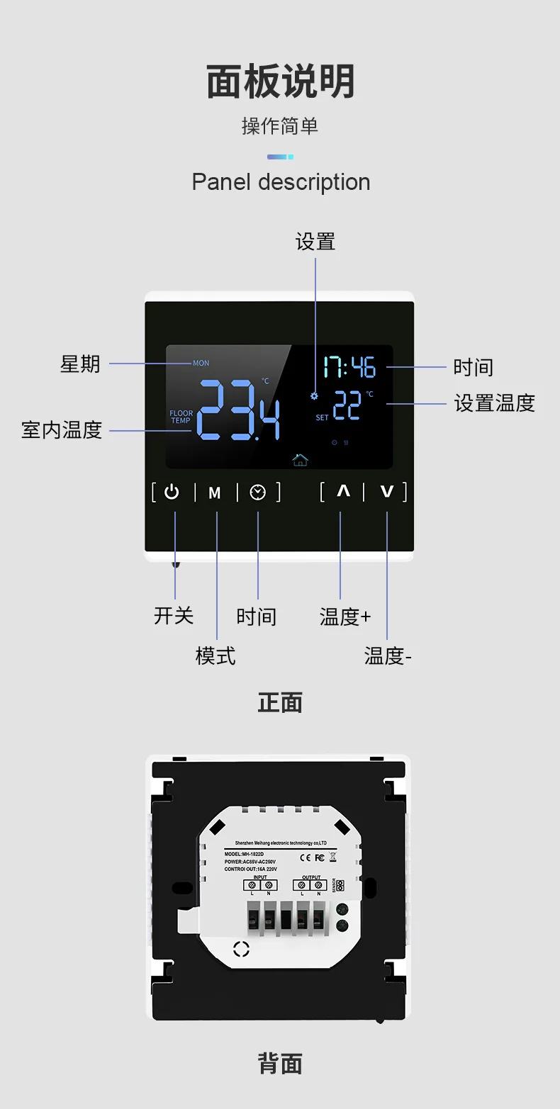 Новый Усовершенствованный смарт-термостат, сенсорный ЖК-экран, электрическое Напольное отопление, электрический нагревательный температурный контроллер Новые обновленные технические данные Рабочее напряжение: AC85 ~ 240V 50/60Hz Точность: 1 ℃ Датчик зонда: NTC (10K) 1% @ 25 ℃ Максимальная нагрузка: 16А Температура рабочей среды: 0 ~ 70 ℃ Диапазон регулировки температуры: 5 ~ 50 ℃ Кнопка: сенсорная кнопка Выход: реле переключателя -План работы: Установите Цикл каждые 1 неделю -Способ установки: настенный -Размер (мм): 85*85*16 > Функция постоянной температуры 1. Функция памяти Запомните все настройки после внезапного отключения питания. Когда питание включено снова, вам не нужно сбросить его. 2. Программируемая функция Шестиступенчатая программируемая Настройка контроля температуры, программируемый 5 + 2 или 6 + 1. 3. Вставные и внешние два датчика. Включает 3 м кабель внешнего датчика. 4. Функция блокировки ребенка Блокировка термостата во избежание неправильной работы детьми. 5. Подходит для различных систем электрического отопления Термостат подходит для электрических нагревательных устройств, таких как нагревательные кабели, нагревательные колодки и нагревательные пленки. 6. Сенсорный ЖК-экран с черной подсветкой. 7. Функция антифриза: В режиме выключения термостат автоматически включит нагревательное устройство при температуре ниже 5с градусов, а при комнатной температуре выше 7с градусов, термостат автоматически выключает нагревательное устройство. (Этот параметр можно отключить в дополнительных настройках). 8. Поддержка коммутационного дисплея по Фаренгейту (только модели WiFi). Посылка включает в себя: 1 термостат 1X3 метра внешний датчик 2 винта Руководство пользователя на английском языке-1 шт.