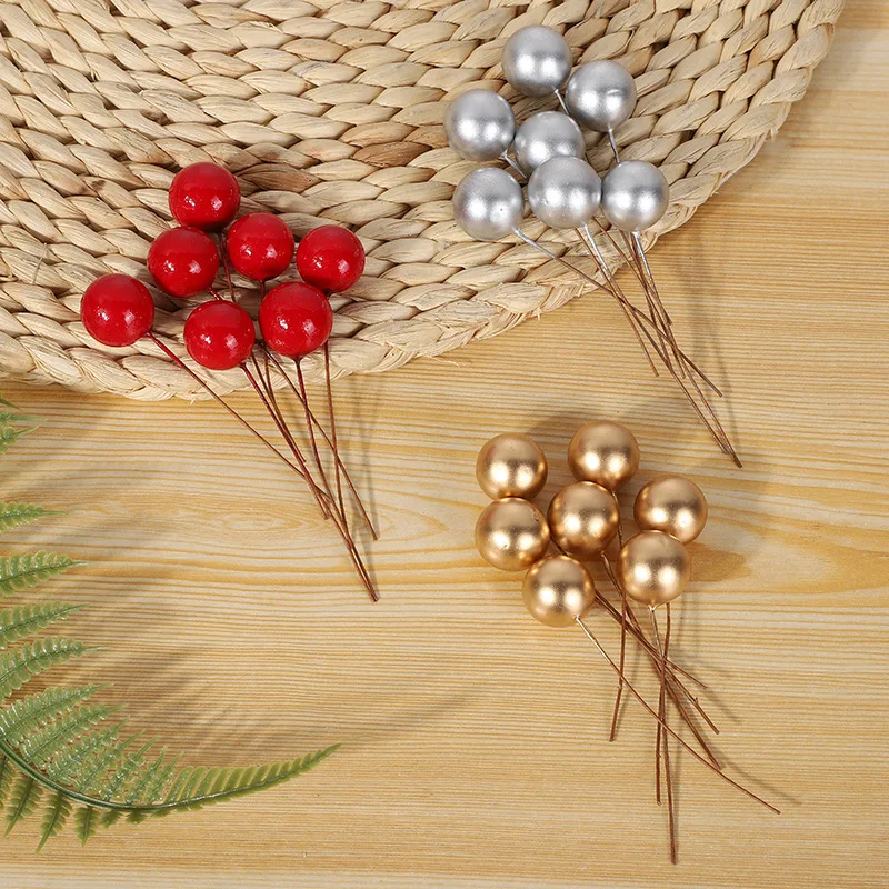 50 шт. 15 мм Искусственные ягоды, золотые, серебряные, красные тычинки вишни, миниатюрные искусственные цветы, жемчужные бусины для поделок, украшения для рождественской вечеринки